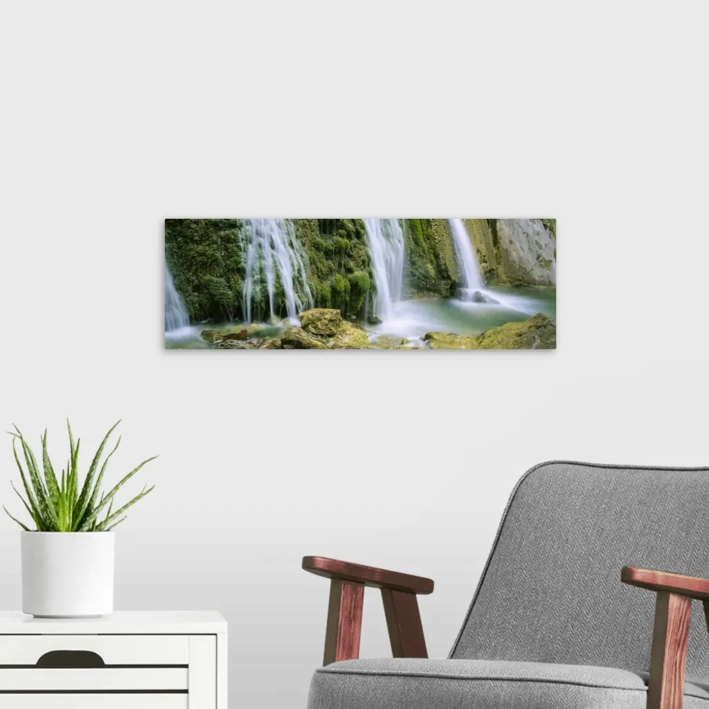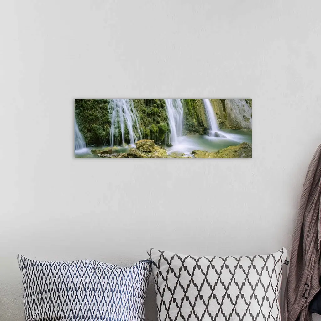 Panoramic photograph taken of several waterfalls cascading over foliage and crashing onto rocks.