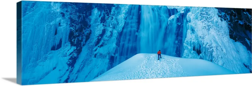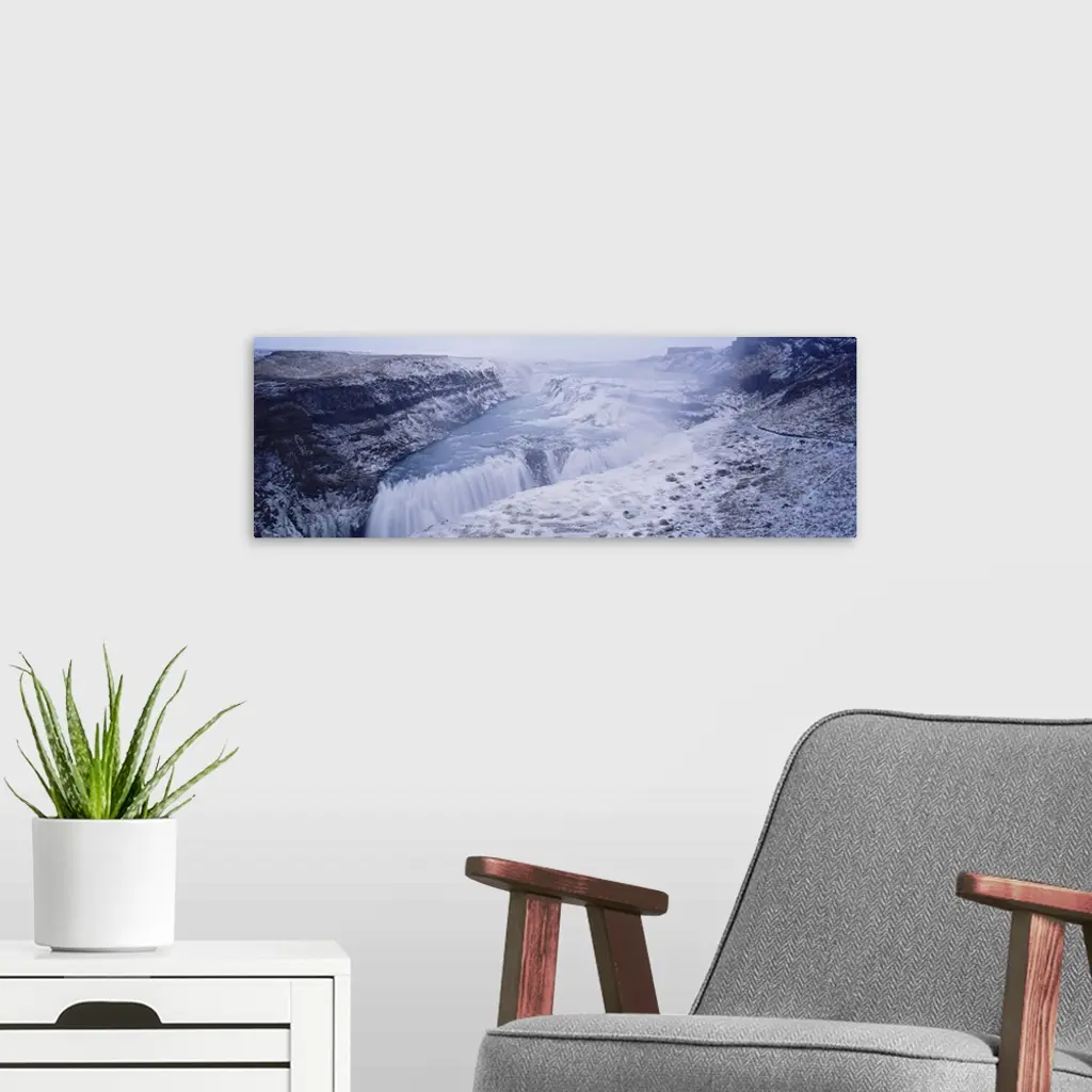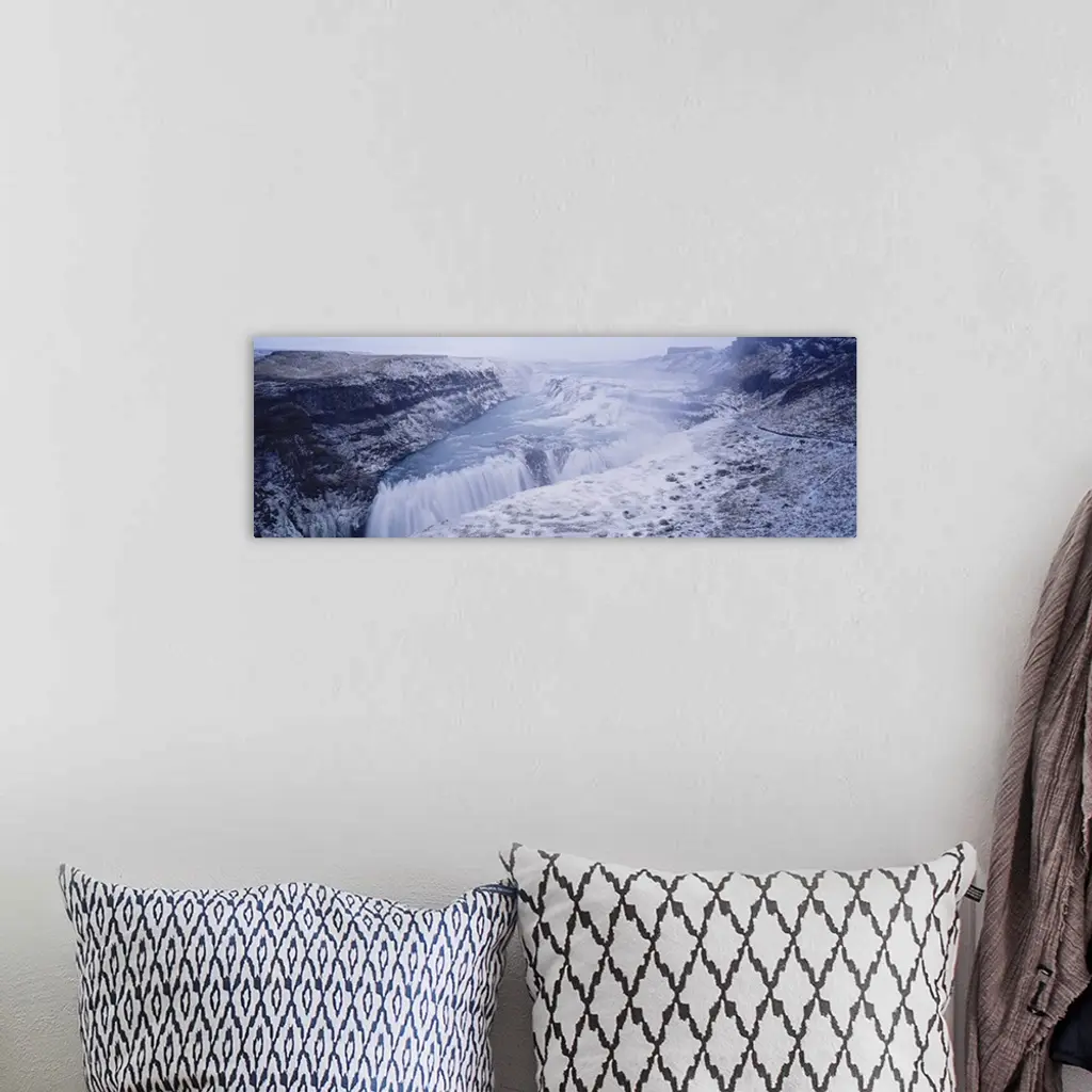 Water flowing through snow covered mountains, Gullfoss Falls, Vesturland, Iceland wall art for home and office decor. Discover canvas art prints, photos, mural, big canvas art and framed wall art in GreatBigCanvas.com's varied collections.