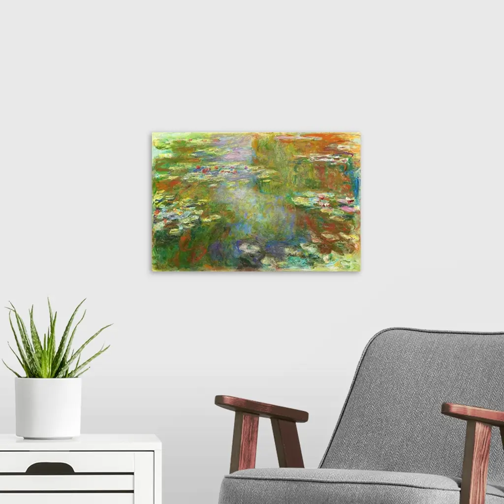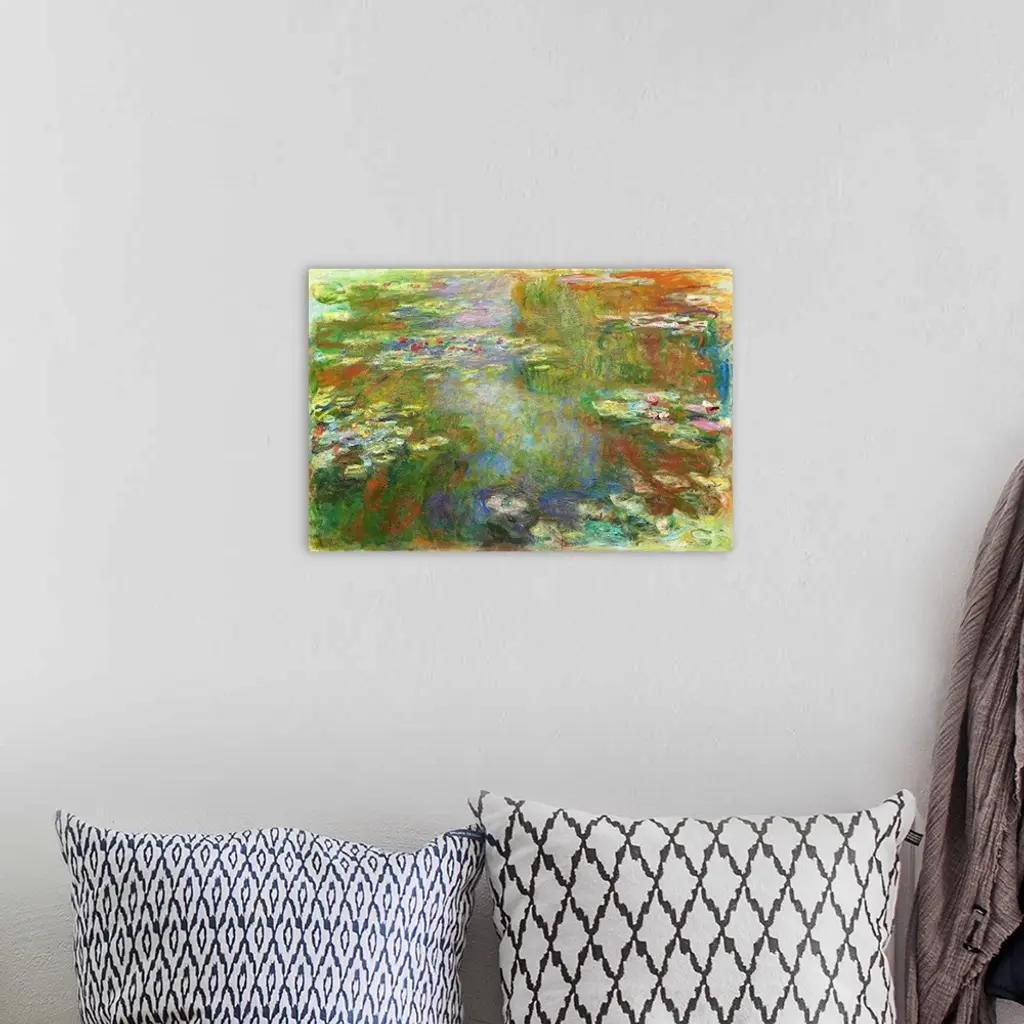 In 1893, three years after buying property at Giverny, Claude Monet began transforming the marshy ground behind his home into a pond, on the narrow end of which he built a Japanese-style wood bridge. Adding both exotic and domestic plantings, including his famous water lilies, the artist created the garden that would be one of his principal subjects for the rest of his life. Water Lily Pond was among the 18 similar versions of the motif that he made in 1899 - 1900; their common theme was the mingling of the lilies with reflections of other vegetation on the pool's surface.