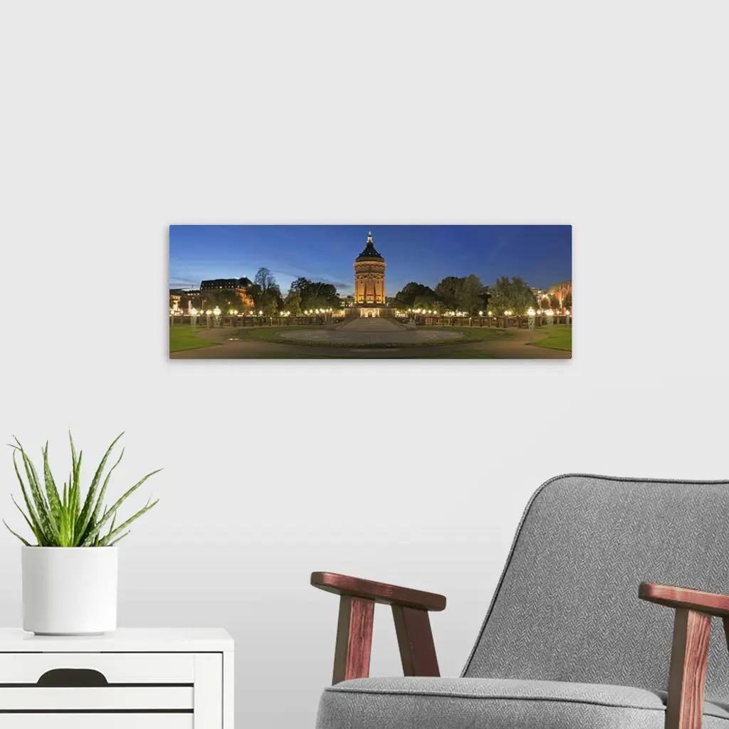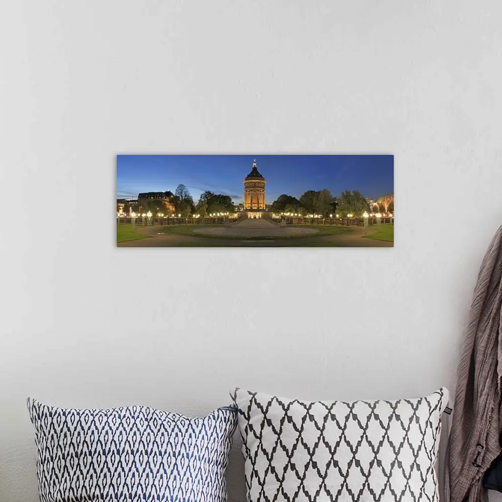 Water tower lit up at dusk, Wasserturm, Baden-Wurttemberg, Germany wall art for home and office decor. Discover canvas art prints, photos, mural, big canvas art and framed wall art in GreatBigCanvas.com's varied collections.