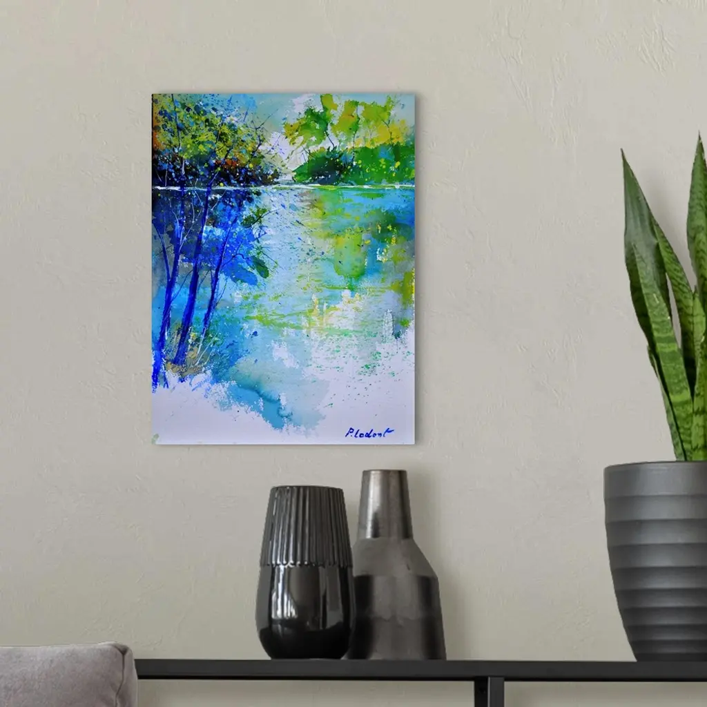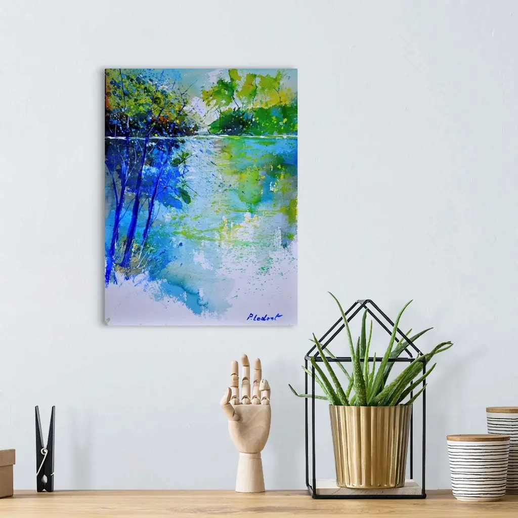 A vertical watercolor landscape of trees next to water in bright colors of green and blue.