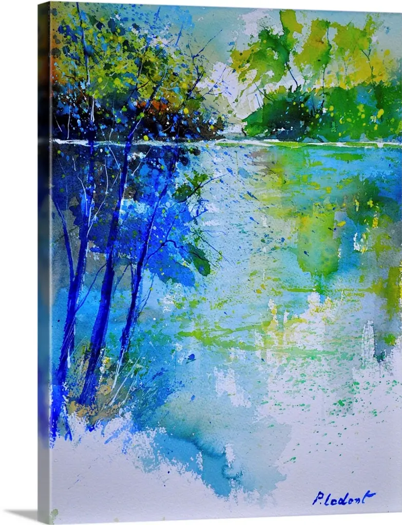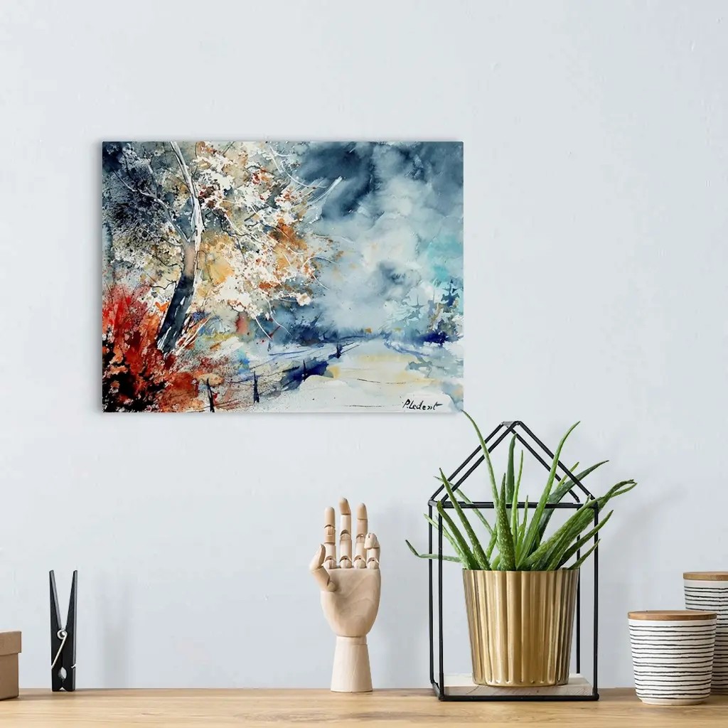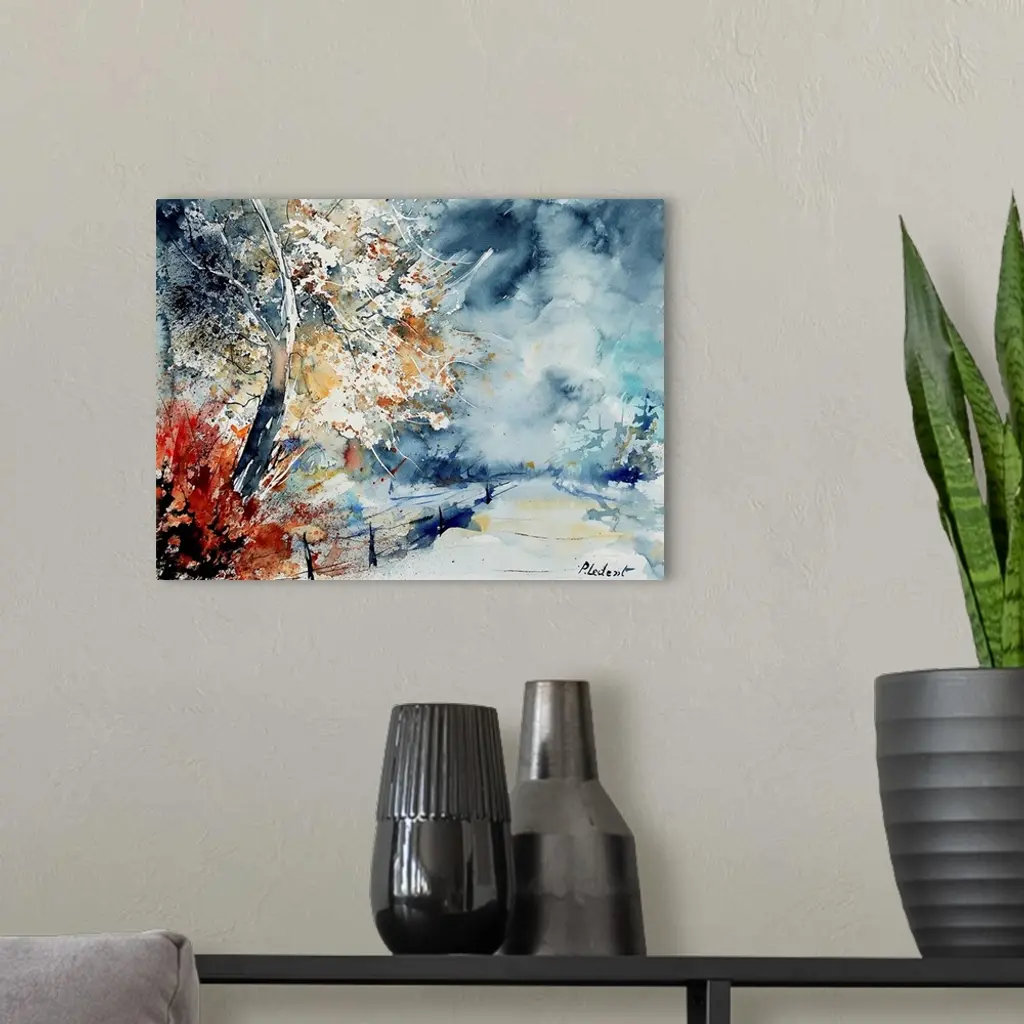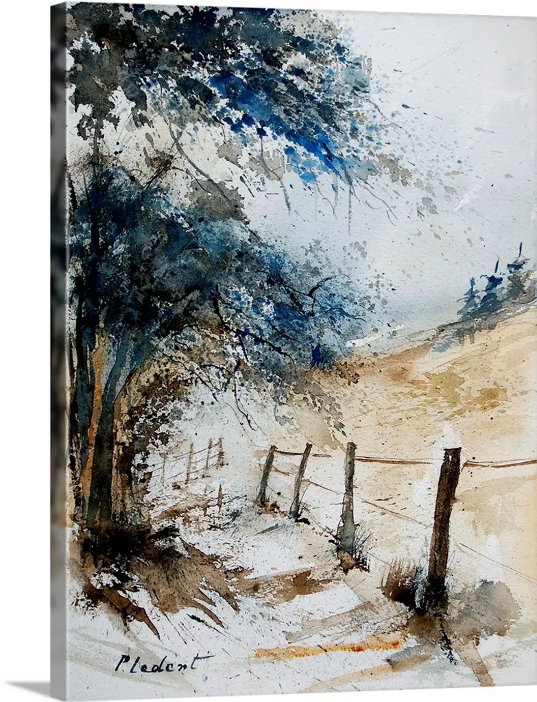 A horizontal watercolor landscape with muted speckled colors of brown, orange and blue.