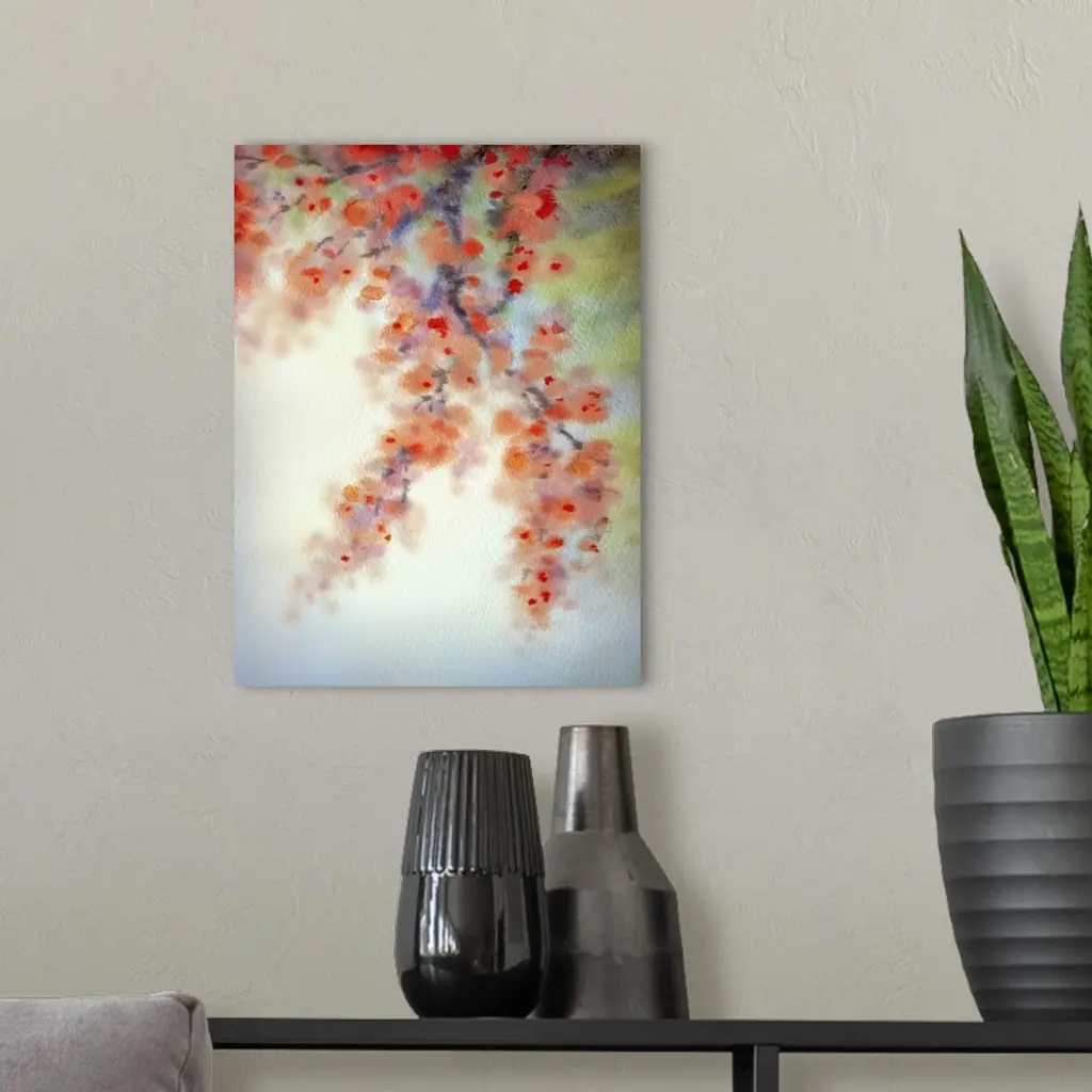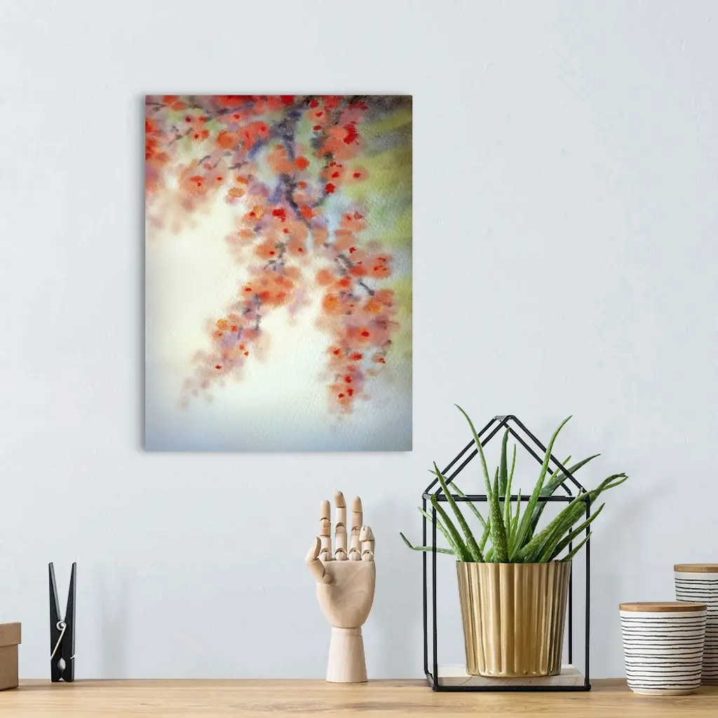 Originally a watercolor romantic backdrop in Japanese style. Beautiful orange flowers on old tree with space for text in gray brume of evening parkland.