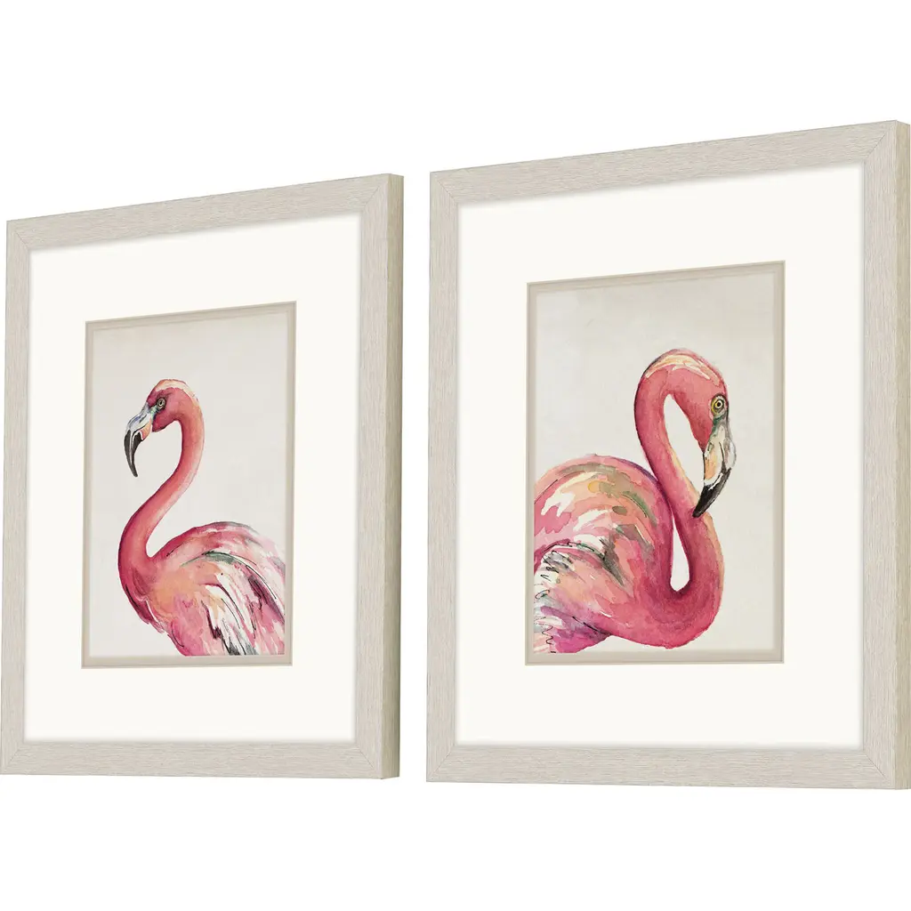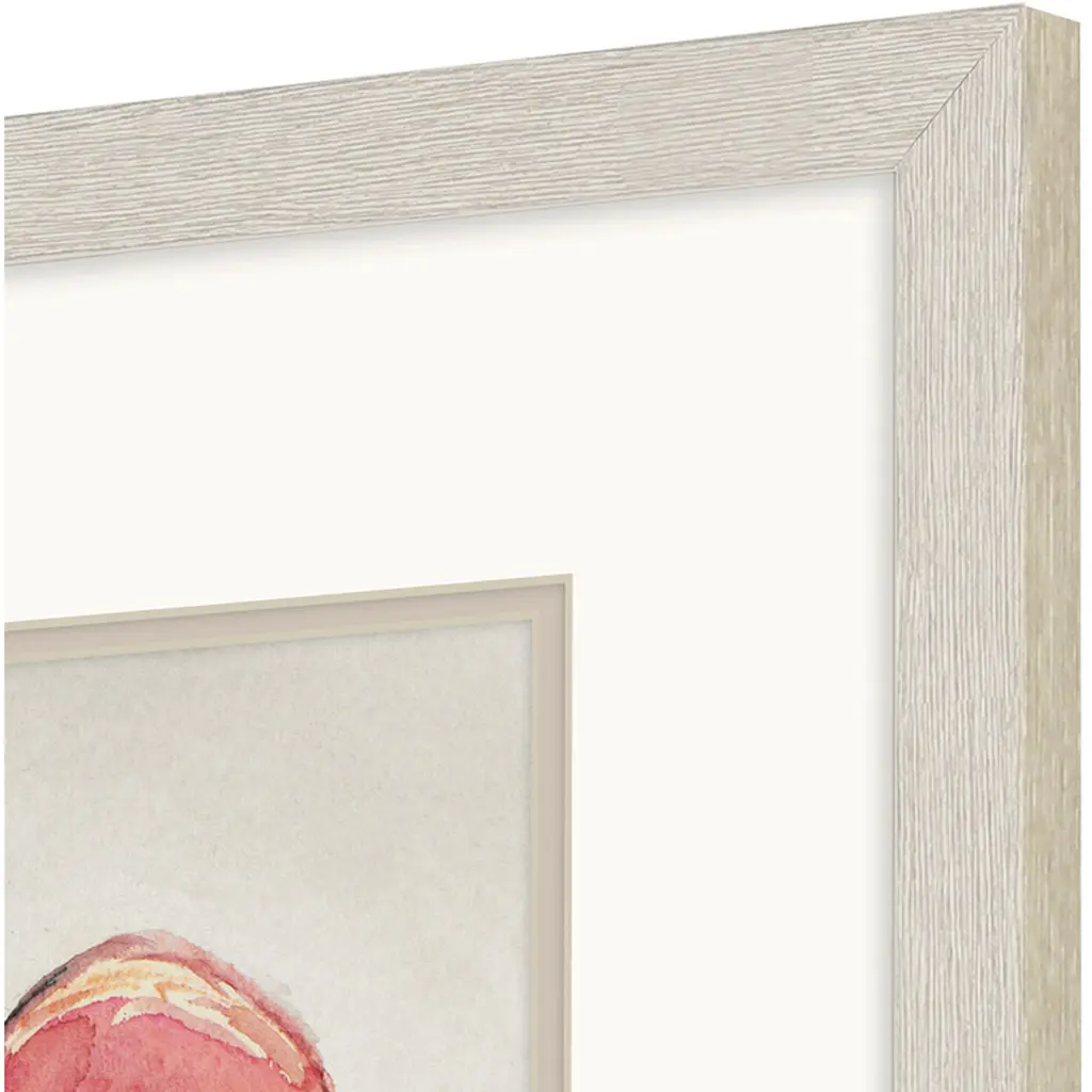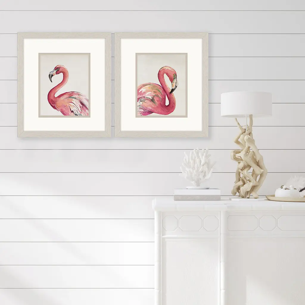 Swanky pink flamingos jazz up a coastal space. Matted in white and framed in a distressed whitewash finish moulding.