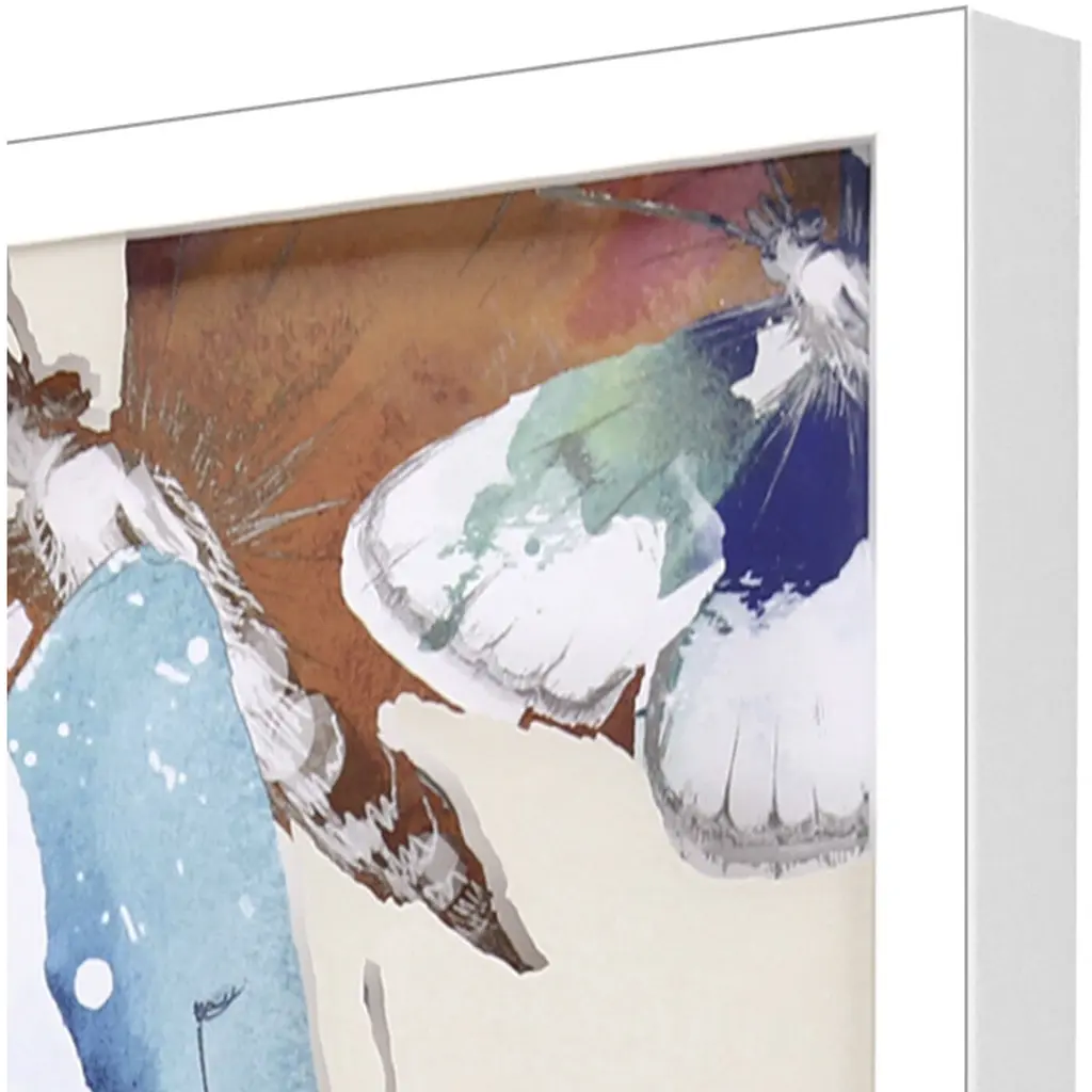 Exclusive mixed media shadow box with reverse hand painted acrylic overlay. Framed in a lacquered white wood shadow box style moulding.