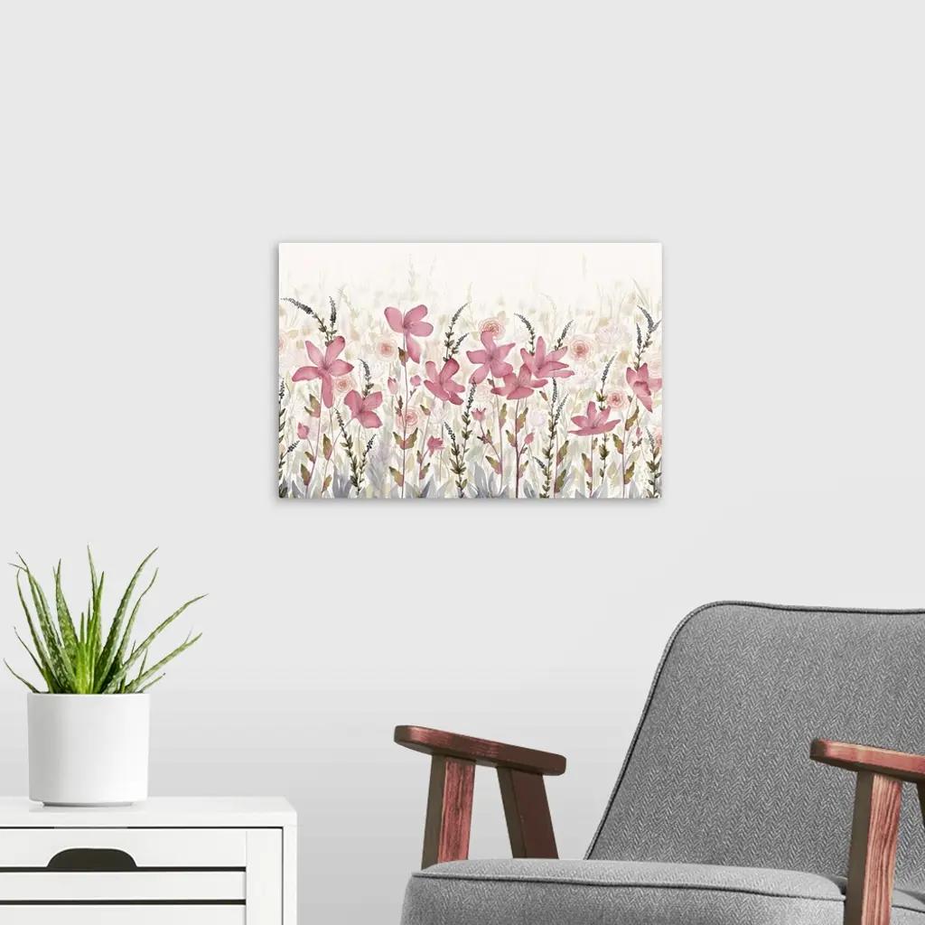 Large horizontal watercolor of a field of pink flowers which faded into the background.