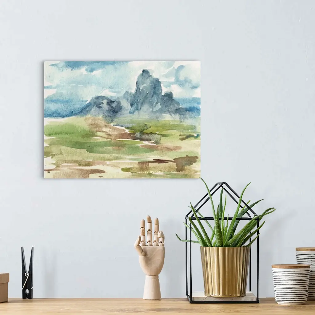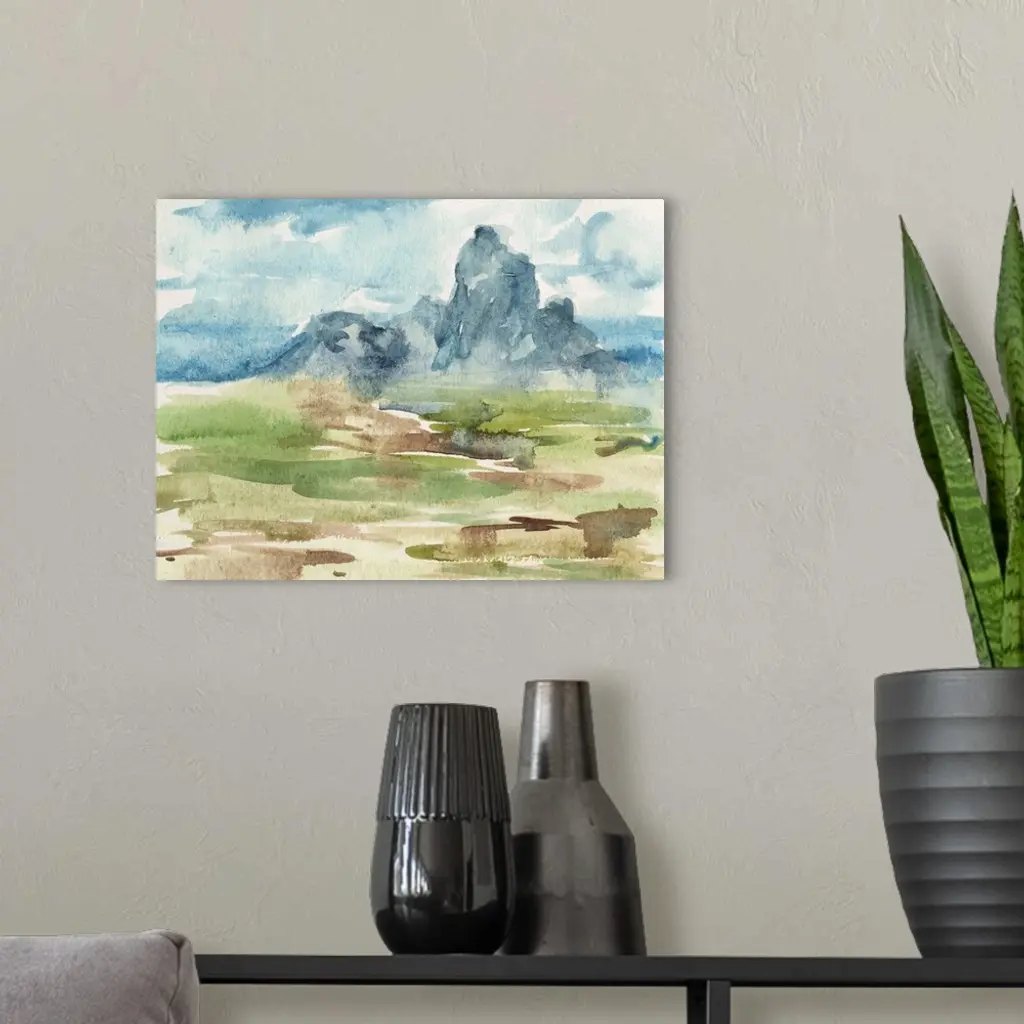 Contemporary watercolor landscape of a field and a mountain in the distance.