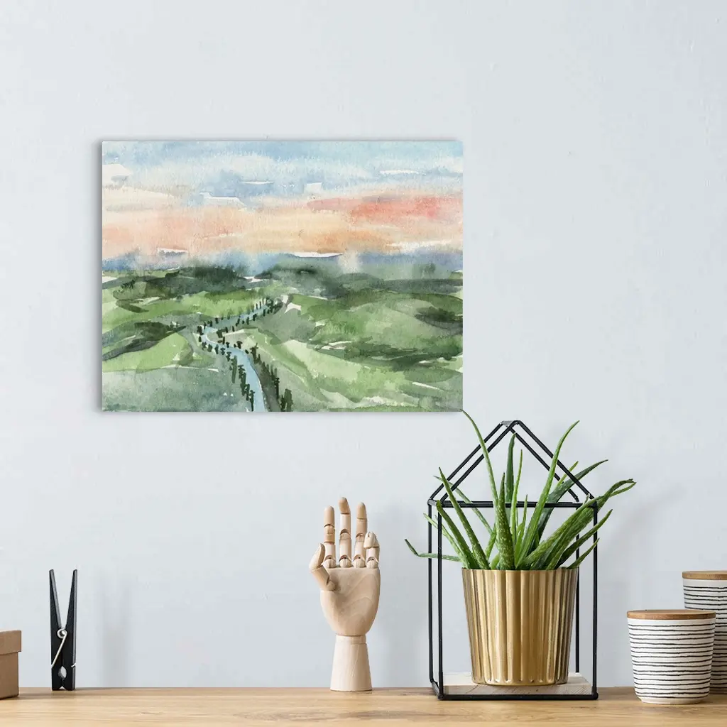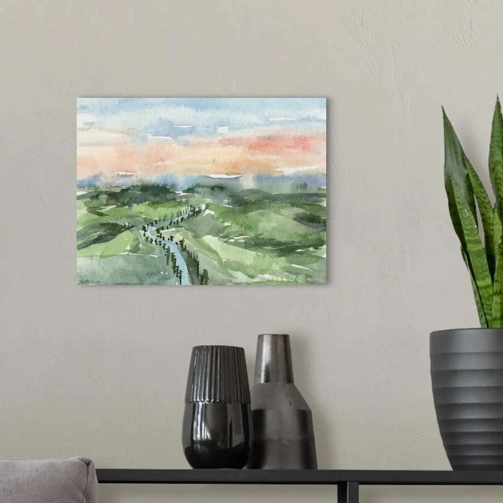 Contemporary watercolor landscape of a river running through a hilly landscape.