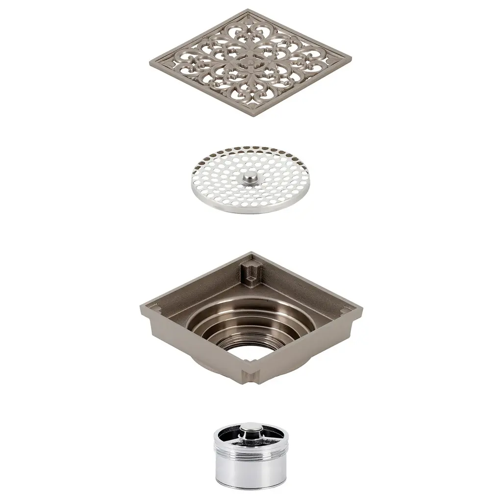 The Watercourse collection features an array of shower drains in multiple finishes. From simple, non-obtrusive grid-cut floor drains to ornate embossed floral patterns the Watercourse collection offers a range of selections. Watercourse drains install a variety of ways and fit a range of both square and circular drain openings. Please see each drain for its detailed specifications and compatibility. The Scroll drain flange in the Watercourse collection fits a 4" x 4" square and features an ornate scrollwork design hair catcher to prevent foreign objects entering your drain. The design comes in Chrome, Polished Brass, Antique Brass, Oil Rubbed Bronze, Polished Nickel, Brushed Brass, Brushed Nickel and Matte Black to match nearly any fixture and any design.FeaturesSolid brass constructionSquare shower drainSuitable for 2" drain pipeOverall dimension: (L)3-15/16" x (W)3-15/16" x (H)3-1/4"2-11 1/2 NPSM connectionFloor installationIncludes cover, dome grid, and drain bodyIncludes integral grid to trap hair and prevent cloggingProp 65 disclaimerWARNING: This product can expose you to chemicals, including lead which is known to the State of California to cause cancer or birth defects or other reproductive harm, for more information, go to www.p65warnings.ca.gov