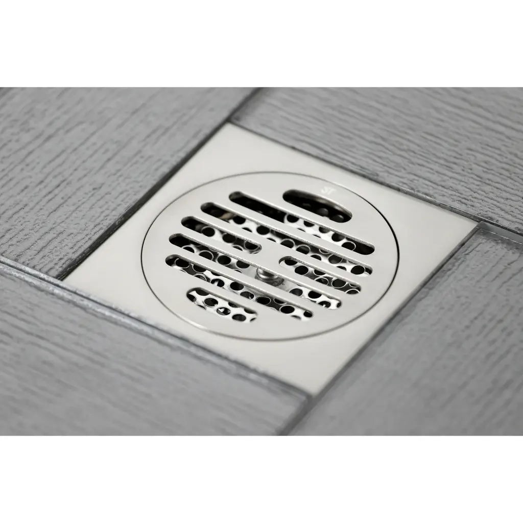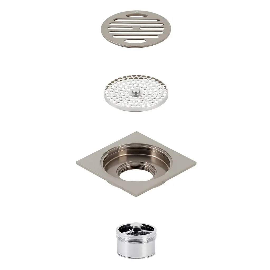 The Watercourse collection features an array of shower drains in multiple finishes. From simple, non-obtrusive grid-cut floor drains to ornate embossed floral patterns the Watercourse collection offers a range of selections. Watercourse drains install a variety of ways and fit a range of both square and circular drain openings. Please see each drain for its detailed specifications and compatibility. The Symmetric drain flange in the Watercourse collection fits a 4" x 4" square and features symmetrical rounded-slot cutouts on its circular hair catcher to prevent foreign objects entering your drain. The design comes in Chrome, Polished Brass, Antique Brass, Oil Rubbed Bronze, Polished Nickel, Brushed Brass, Brushed Nickel and Matte Black to match nearly any fixture and any design.FeaturesSolid brass constructionSquare shower drainOverall dimension: (L)3-15/16" x (W)3-15/16" x (H)2-5/16"Floor installationCompatible with 2" drain outlet pipeIncludes cover, dome grid, and drain bodyIncludes integral grid to trap hair and prevent cloggingProp 65 disclaimerWARNING: This product can expose you to chemicals, including lead which is known to the State of California to cause cancer or birth defects or other reproductive harm, for more information, go to www.p65warnings.ca.gov