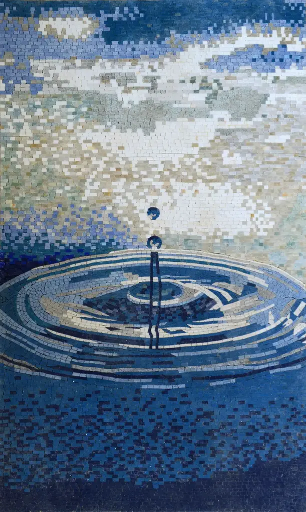 This stunning marble mosaic illustrates in cyan and titanium tiles a still life water drop ruffle in a degradation of light blue dark blue and white.This mosaic is fully handmade with natural marble stones and hand cut tiles and can be customized by size and colors.The waterdrop will Create a distinctively beautiful bathroom backsplash. This mosaic design makes stylish pool art too. Sq.Ft. : 10.09Marble Count : 11000Backing: Your Mosaic comes on a mesh Backing Mosaic Uses: Floors, Walls both Indoor or Outdoor as well as wet placesTechnique: Handmade