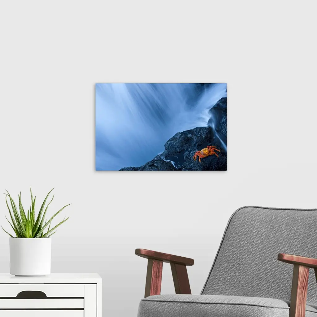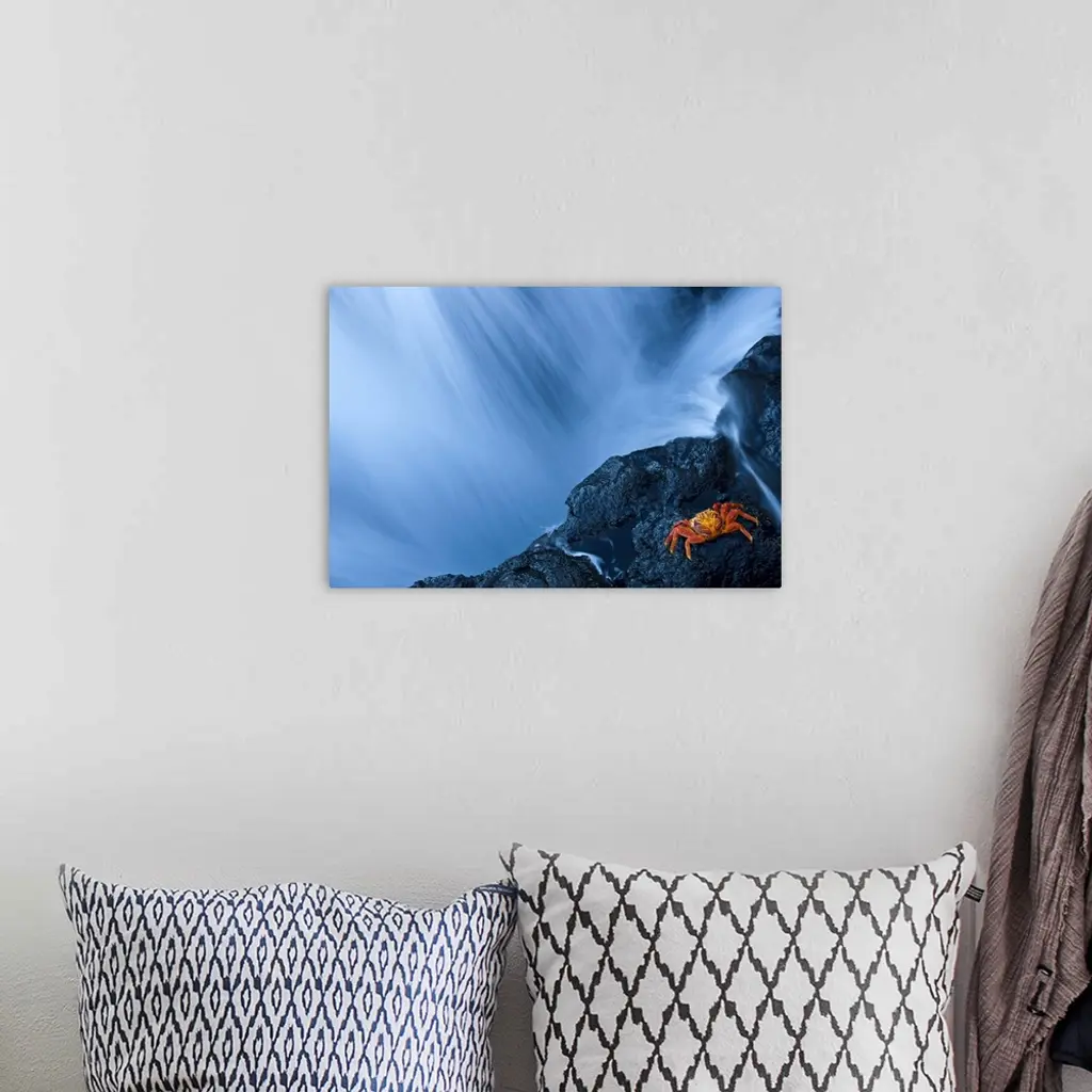 Waterfall And A Resting Crab, San Salvador Island, Galapagos, Ecuador