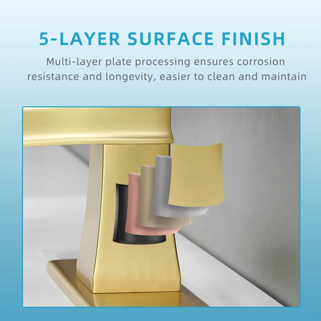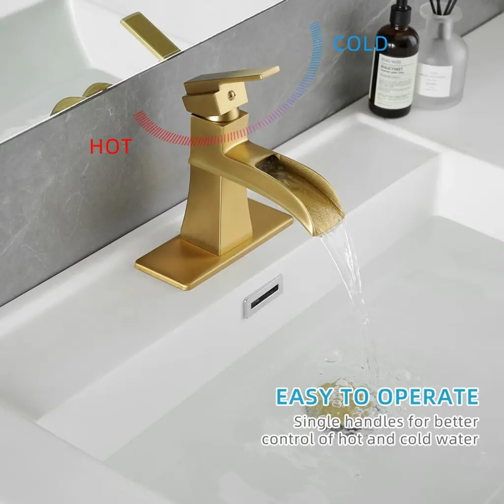 Brushed waterfall bathroom faucet with deck plate and single handle mixer, suitable for 1-hole sinks.