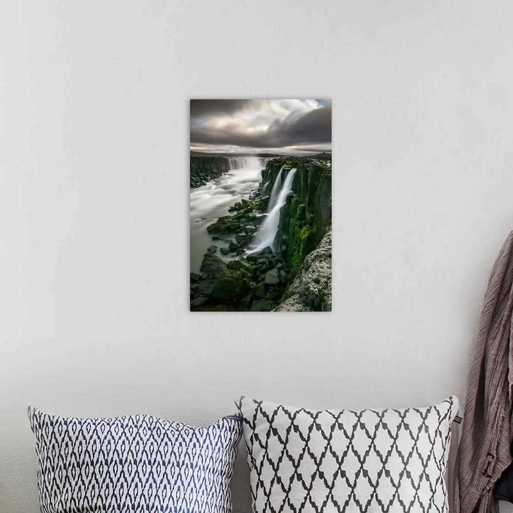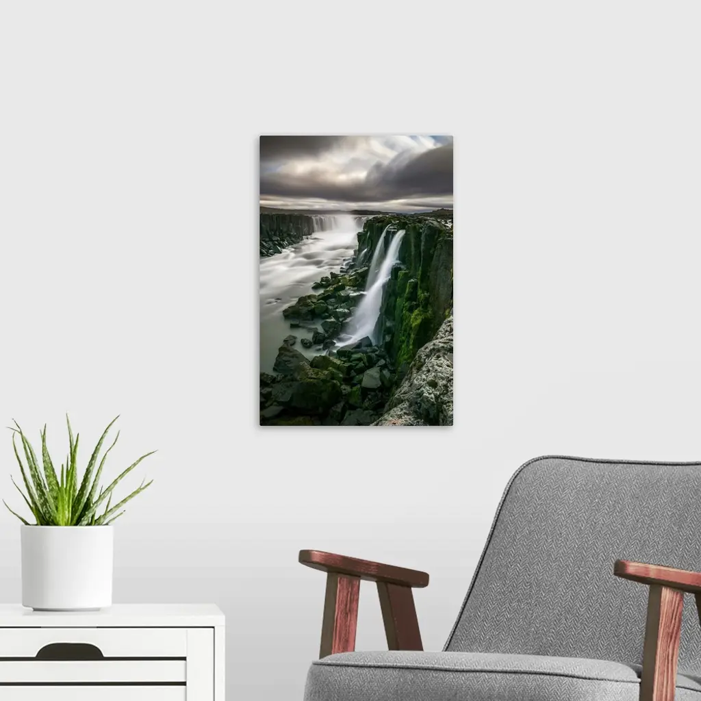 Waterfall Flowing Over Moss Covered Cliffs; Selfoss, Iceland