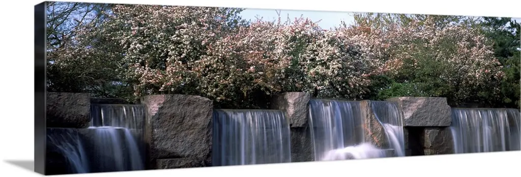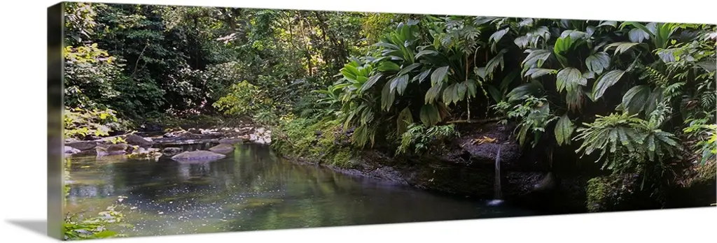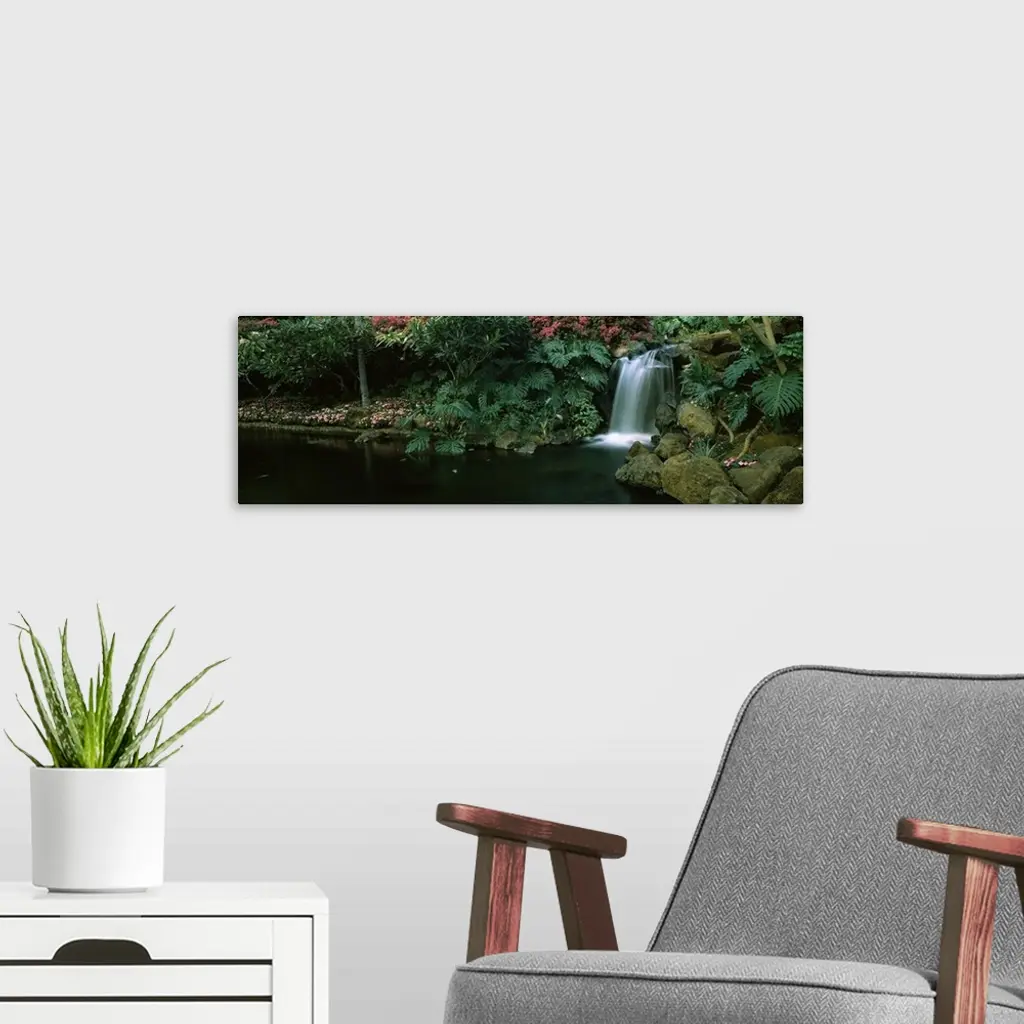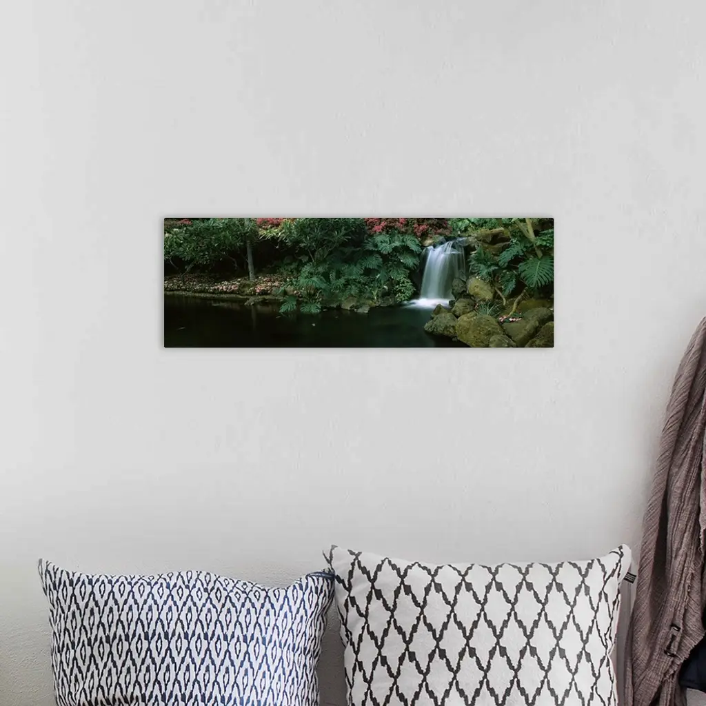 A panoramic photograph of a tropical garden, small cascade tumbles into a circular pool lined with palm fronts and small trees.