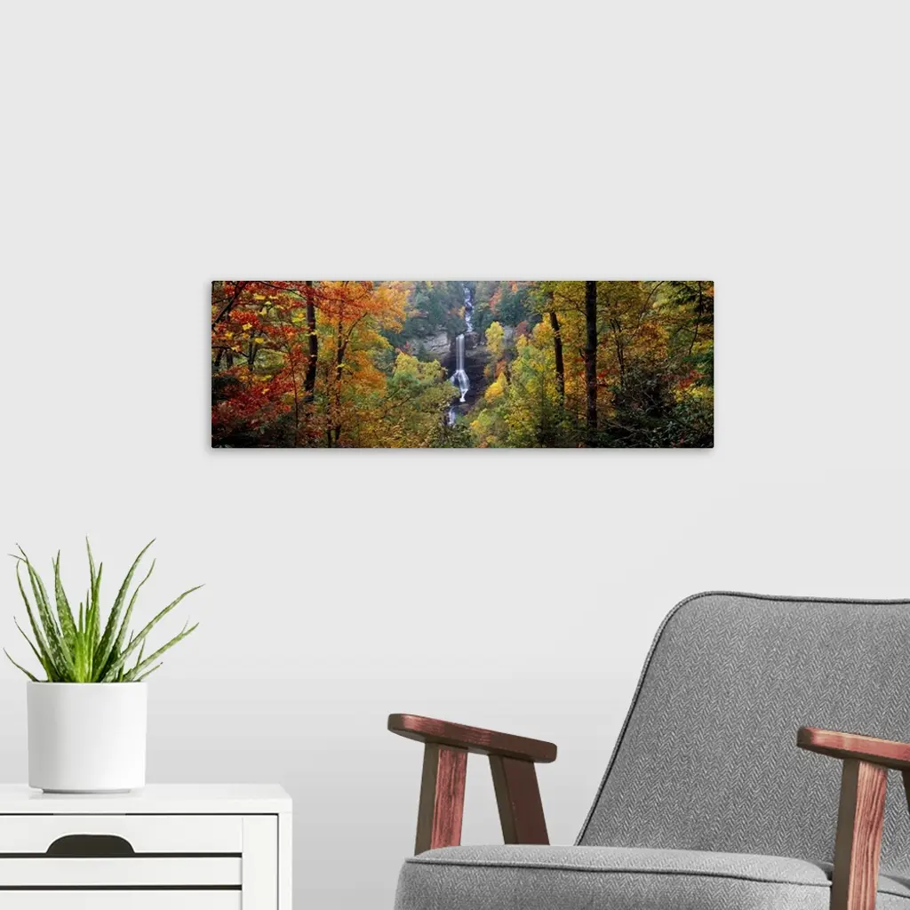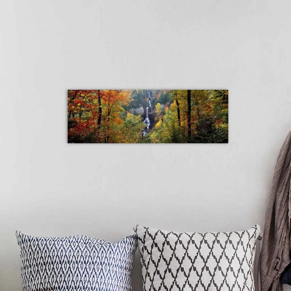 This panoramic wall art is a photograph of a waterfall cascading down a sheet rock face in an autumn forest in the Appalachian Mountains.