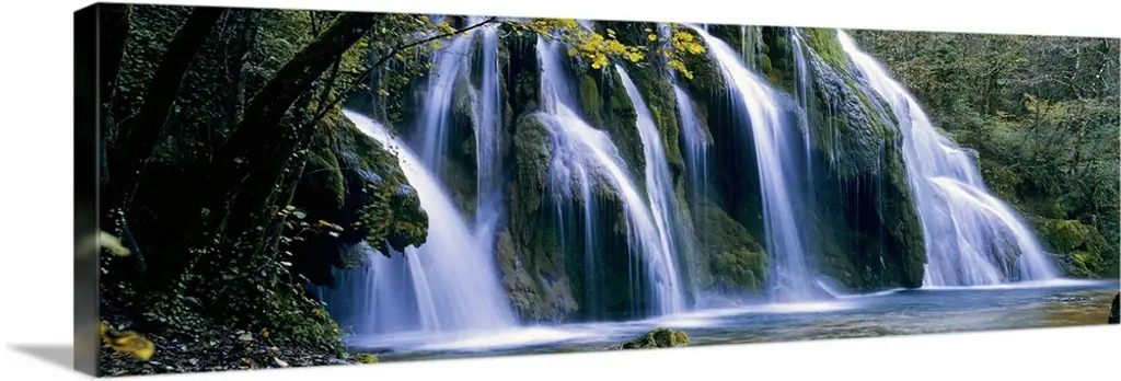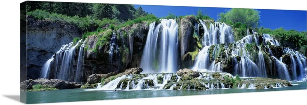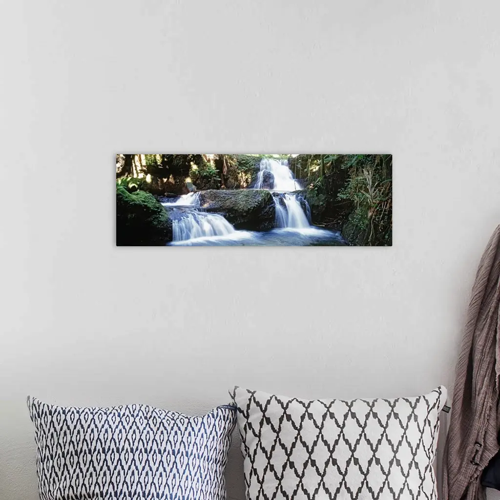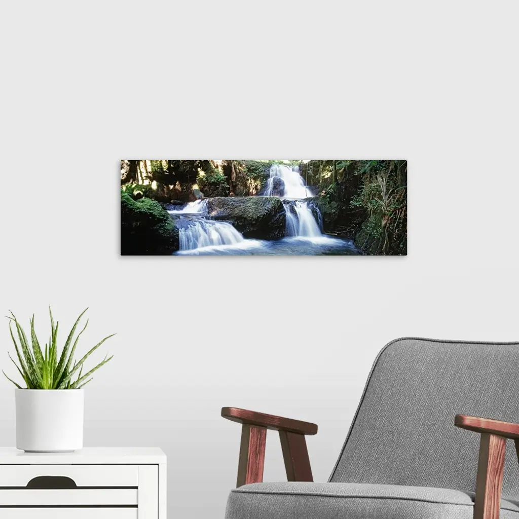 Panoramic photograph of several small waterfalls surrounded by rocky terrain and a lush, green forest in Hilo, Hawaii.