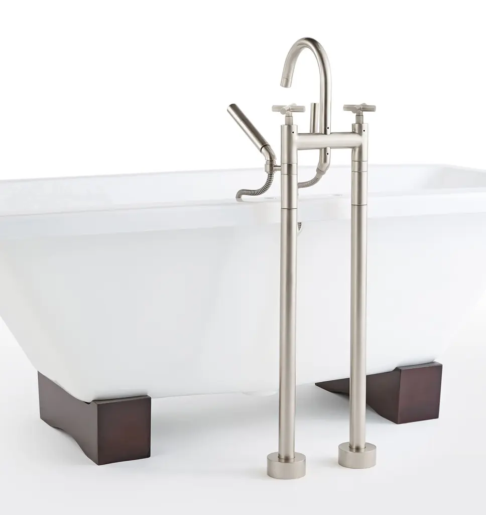 Featuring a durable, rounded design with soft edges and cross handles, our Waterhouse Tub Filler with Handshower is floor-mounted for use with free-standing tubs.