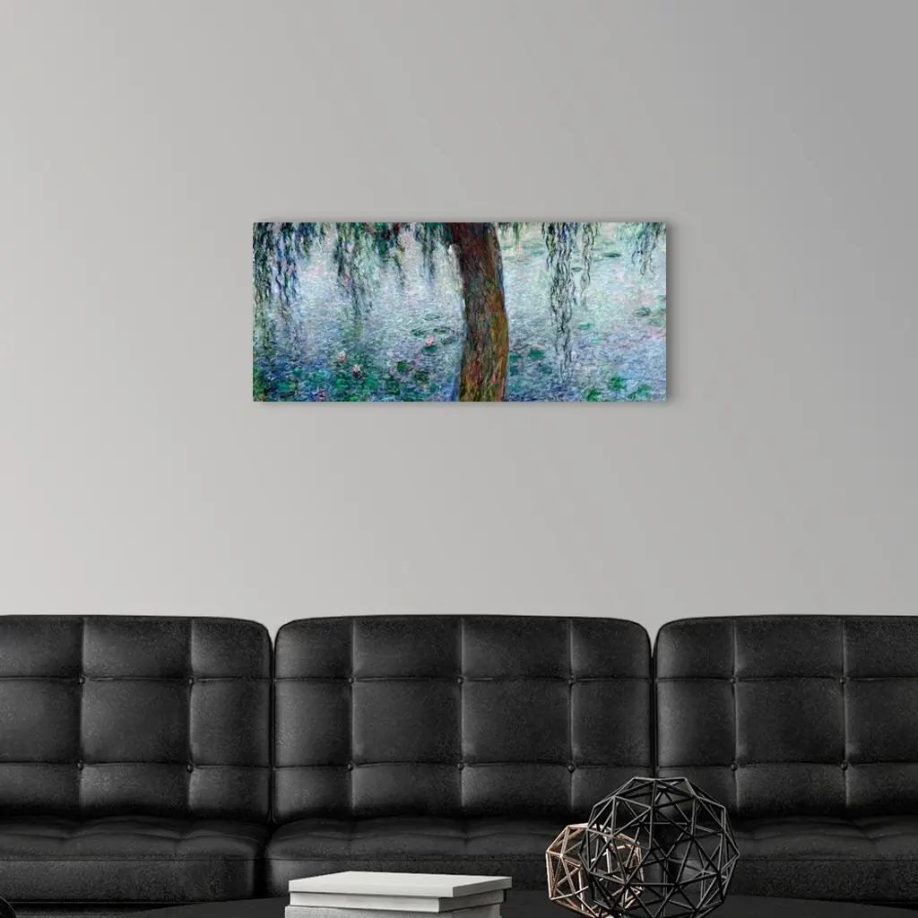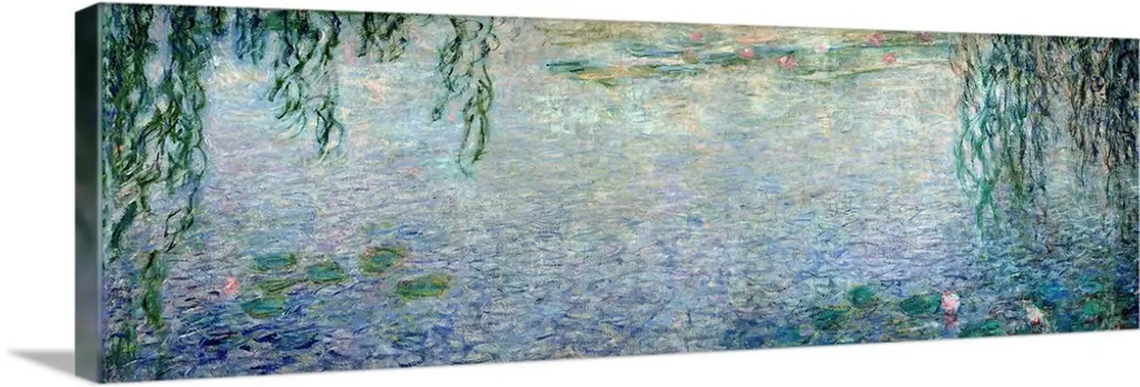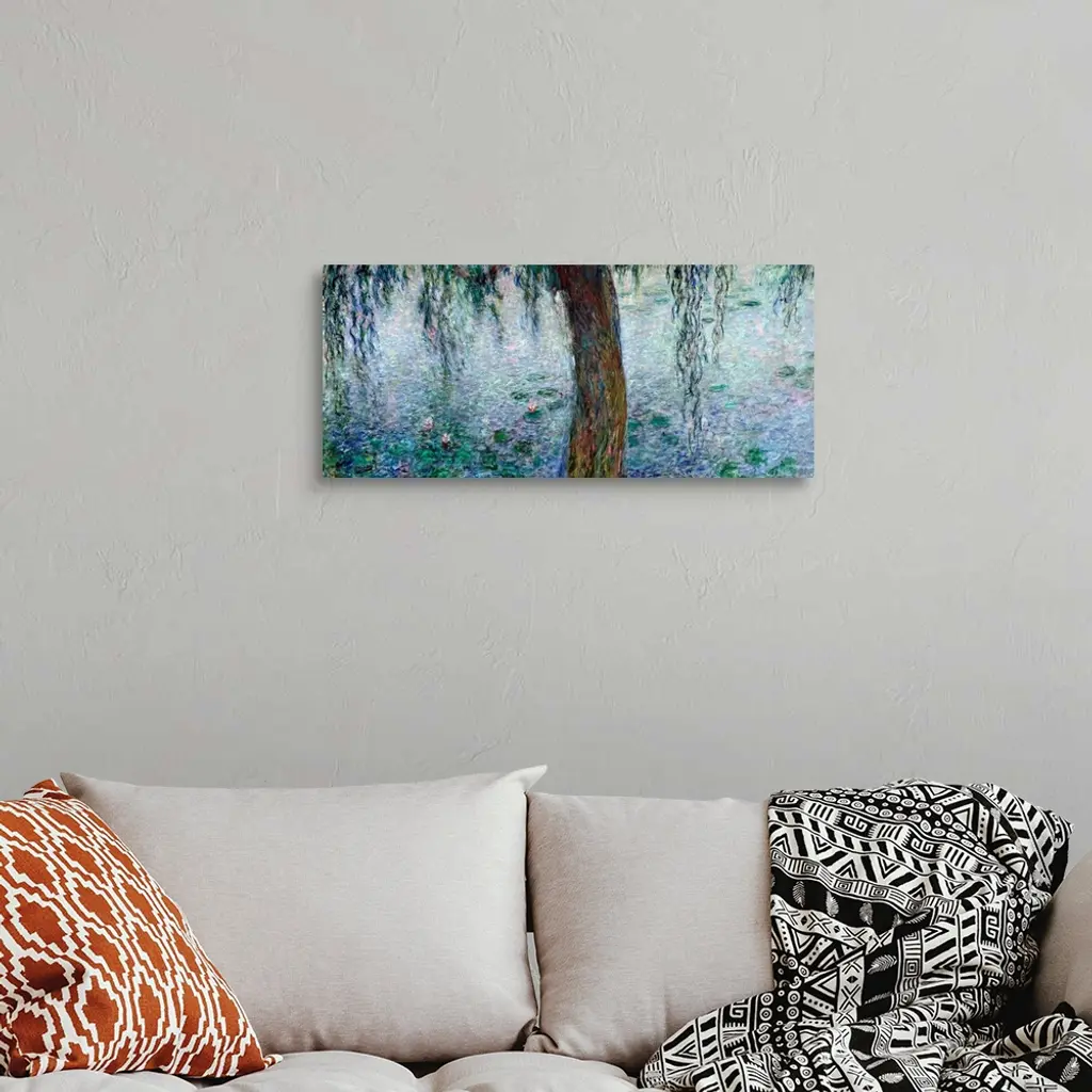 Panoramic classic art showcases a lone tree as it hangs over a pond littered with lily pads.