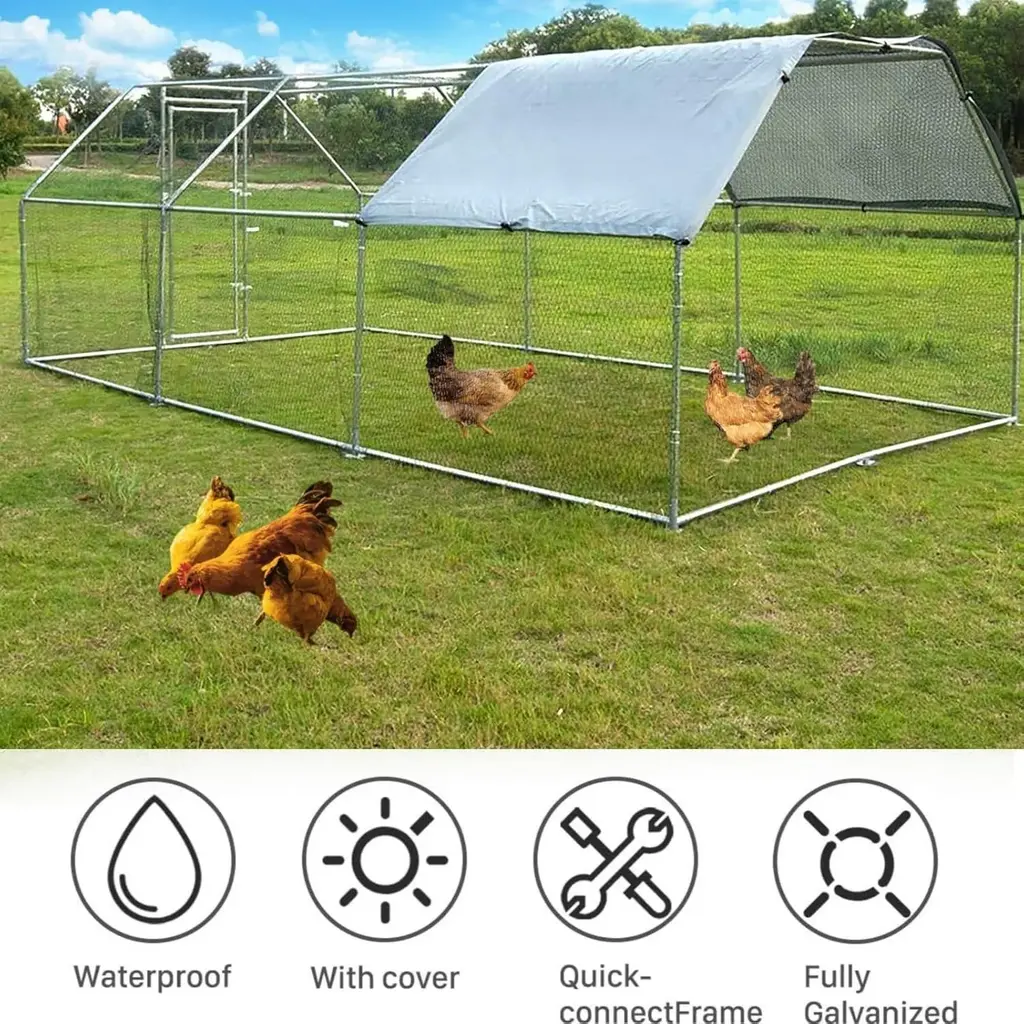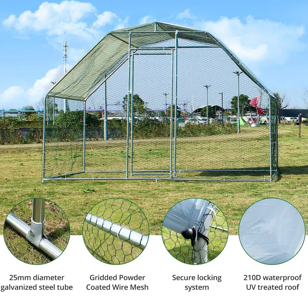 Durable Steel Structure: The chicken coop is made of upgraded reinforced steel pipes, 1.26 inches in diameter and 1mm in thickness, the wall thickness of the pipes we use is twice that of other people's cheap chicken coop pipes, which is extremely strong and durable, no sharp edges, no longer worry about rust, not easy to deform, strong and stable enough even in windy and heavy rain.PVC Coated Hexagonal Wire Mesh: The walls of the chicken coop are made of PVC coated hexagonal wire mesh, which is durable and not easy to damage, and the small gaps between the meshes add security for your chickens and protect them from certain predators. In addition, the wire mesh ensures that the chickens will not escape from the chicken coop while maximizing ventilation.Waterproof Sun Protection Cover: The iron chicken coop comes with a waterproof sun protection cover, the UV-proof waterproof large chicken coop cover is made of durable Oxford fabric with a silver coating that will not tear or fade, the durable UV and waterproof cover protects your chickens from outdoor rain and snow, in addition, the roof can be easily removed so that the chickens can enjoy the sun freely.Easy to install: Our large chicken coop is easy to install, comes with an assembly instruction manual, the spring buckle design allows you to build the chicken coop easily and quickly, allowing you to complete the assembly in minutes, without the help of any tools, no complications; you can wear gloves for safe installation, saving you time and providing you with a sturdy metal chicken coop.Practical outdoor large chicken coop: The chicken coop can accommodate more than dozens of chickens, rabbits, ducks and other poultry at the same time, and is a habitat for small animals. It can also be set up as a planting protection shed. The pipes of the chicken coop are galvanized, so it is rust-proof, and the smooth surface is easy to clean with a damp cloth or running water.