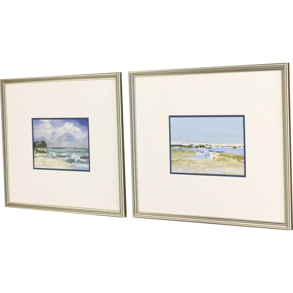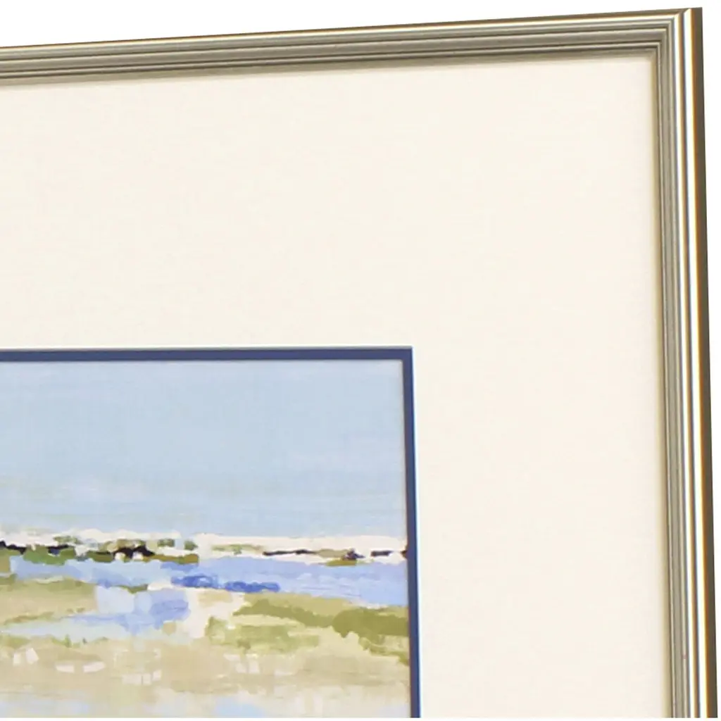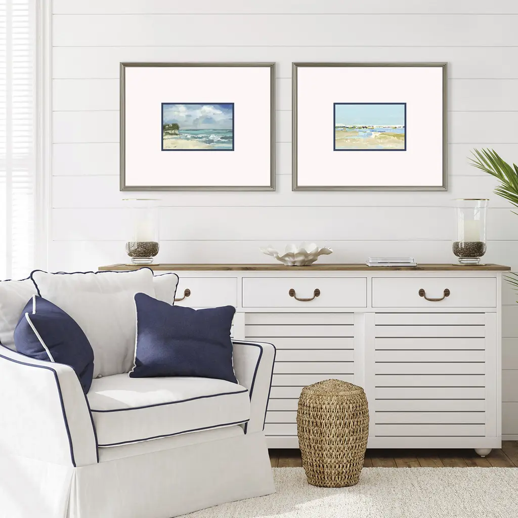 Coastal scenes are matted in white and framed in a classic silver wood.
