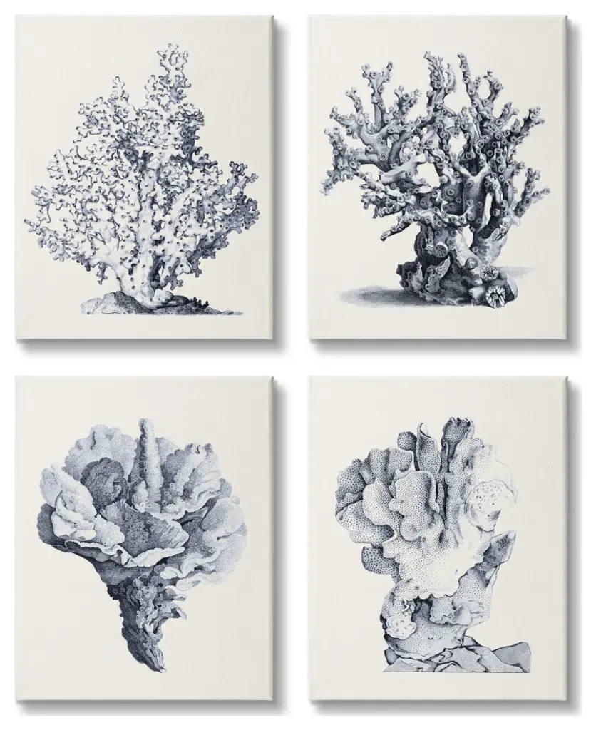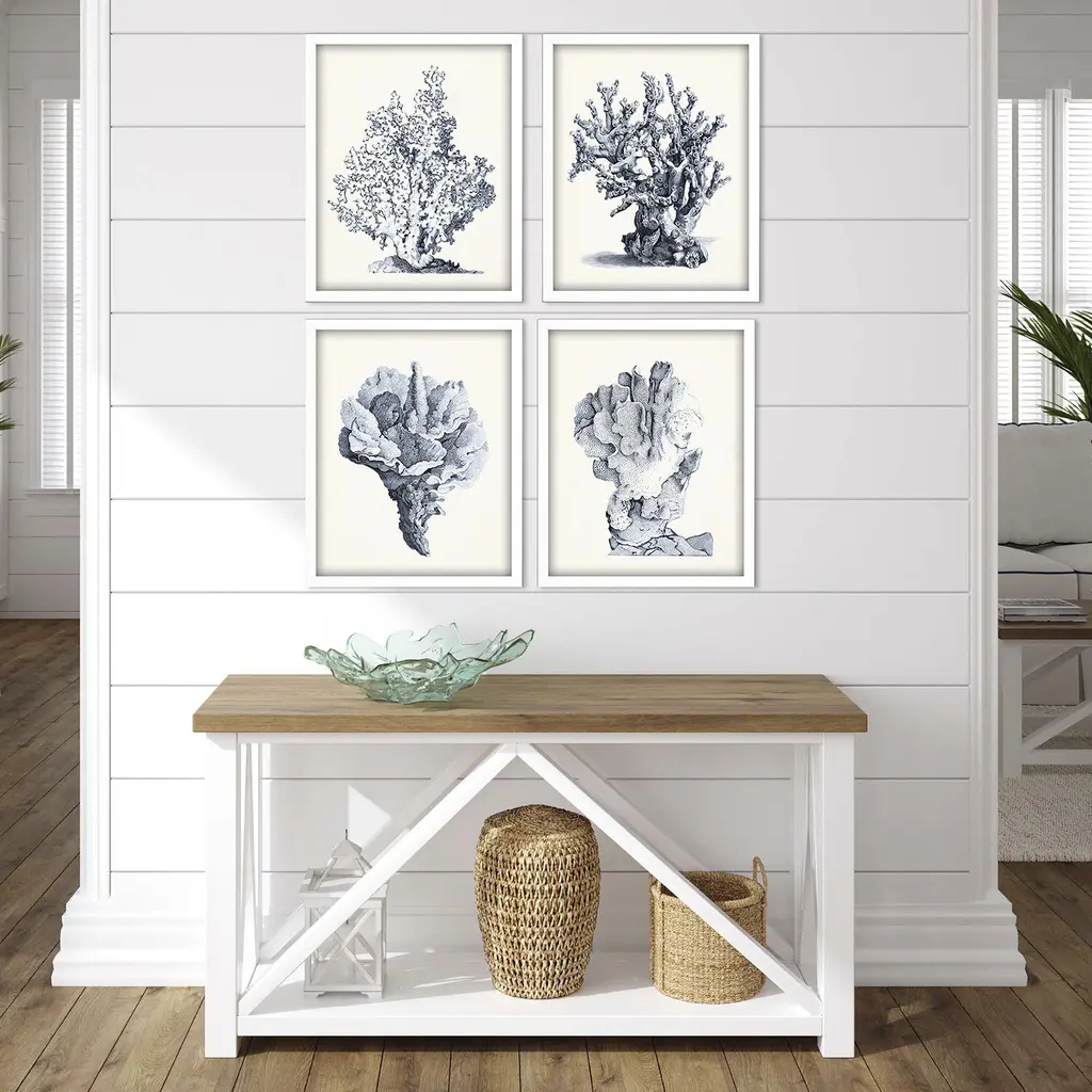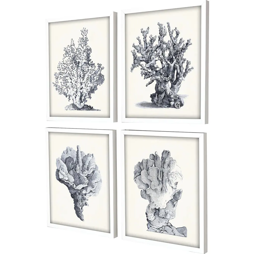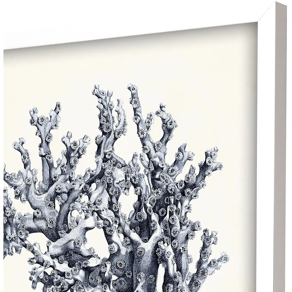 Coral imagery is framed in a lacquered white wood shadow box style moulding.