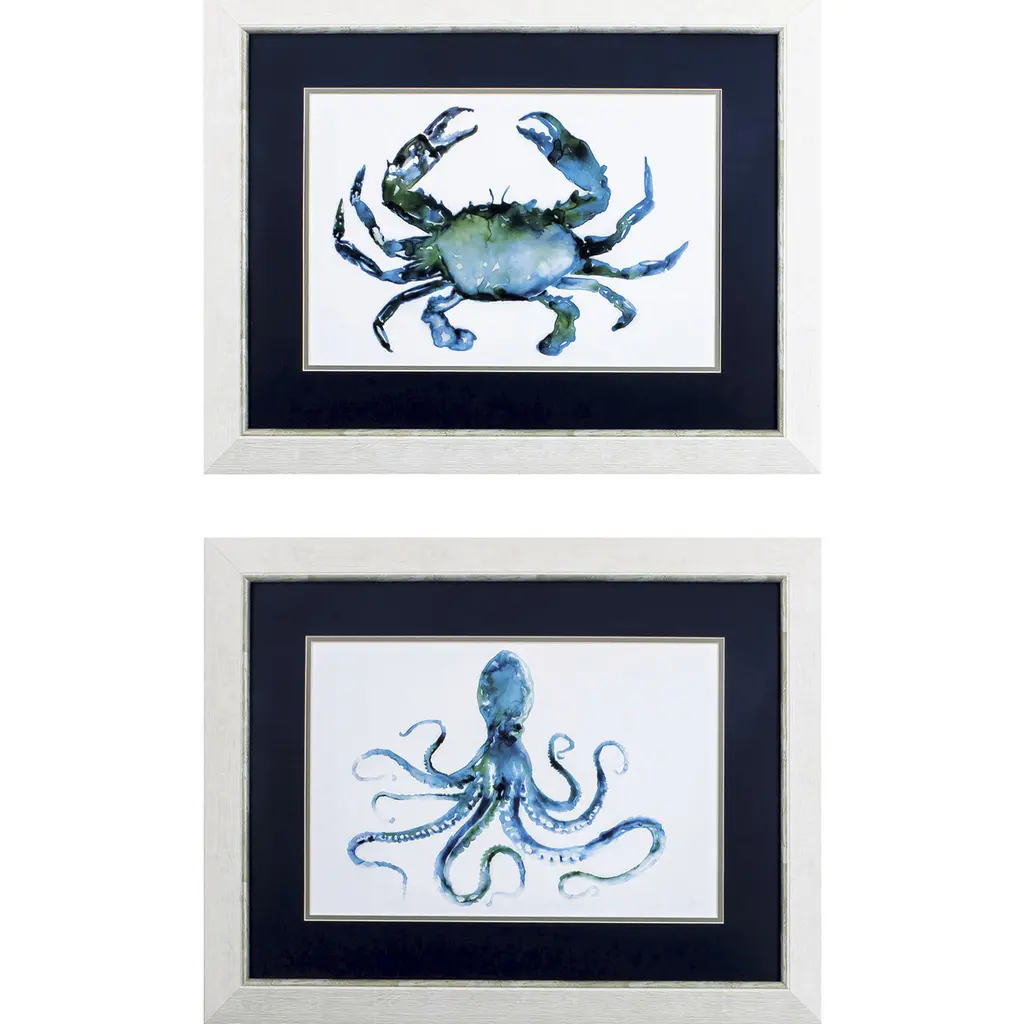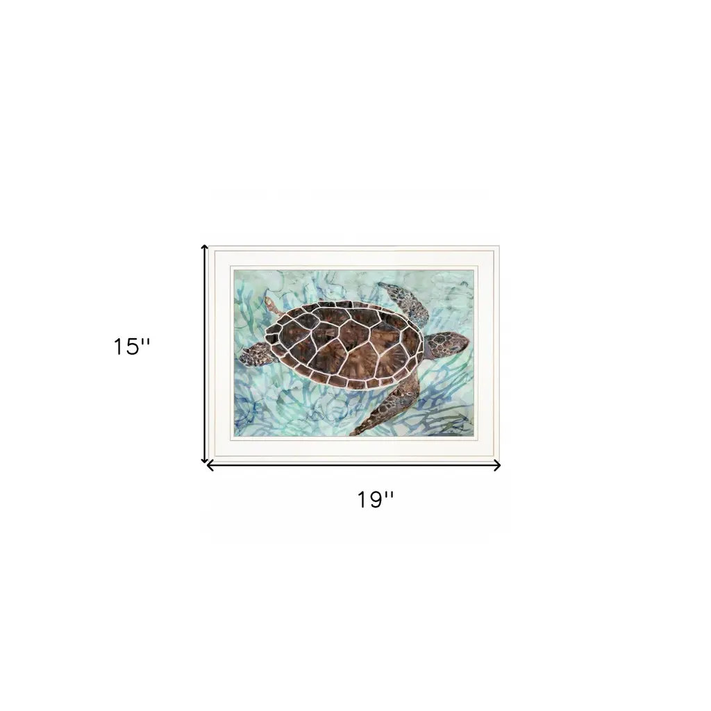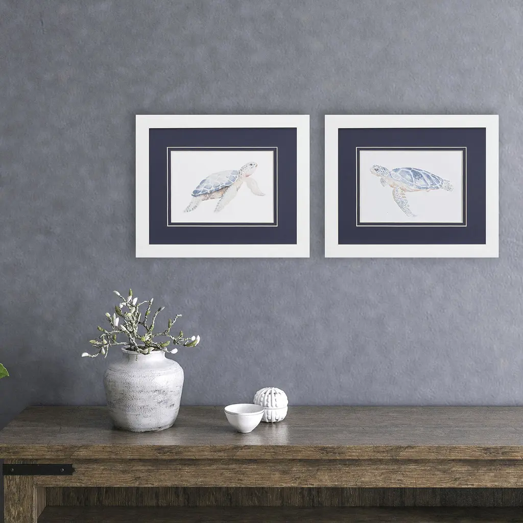 A set of two coastal turtle images that are accentuated with double matting. These pieces are framed under glass and paired with a white frame.