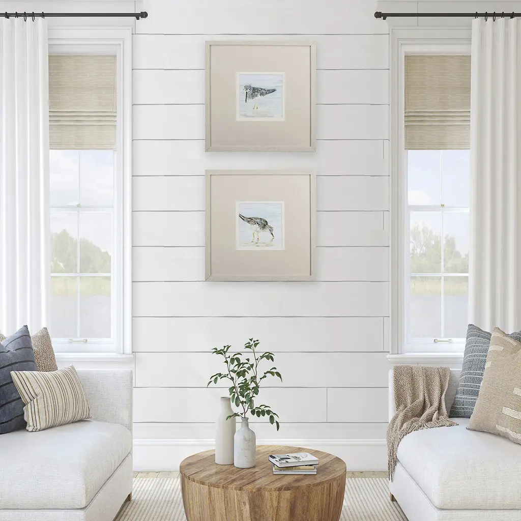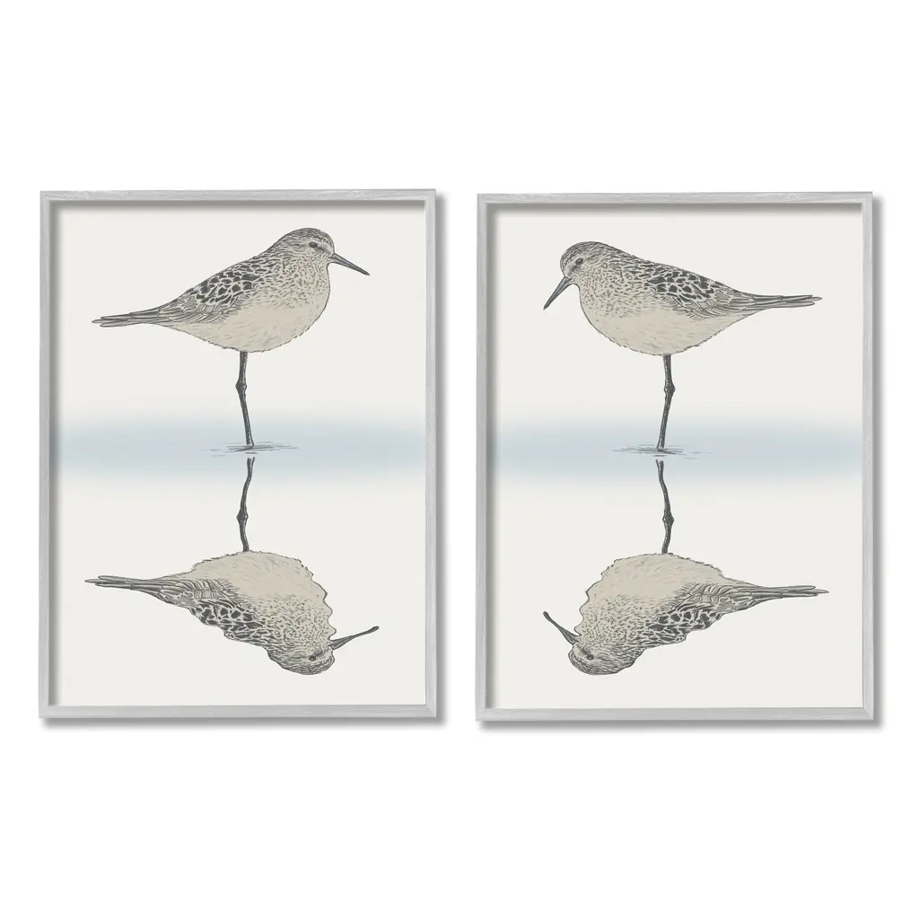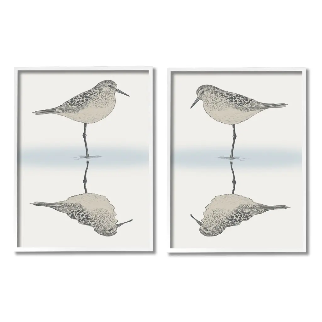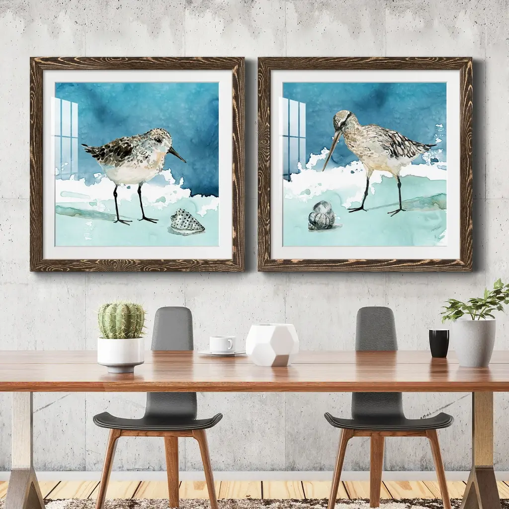 A set of four coastal sandpiper prints that are accentuated with a large mat and framed under glass with a textured white wash wood tone frame.