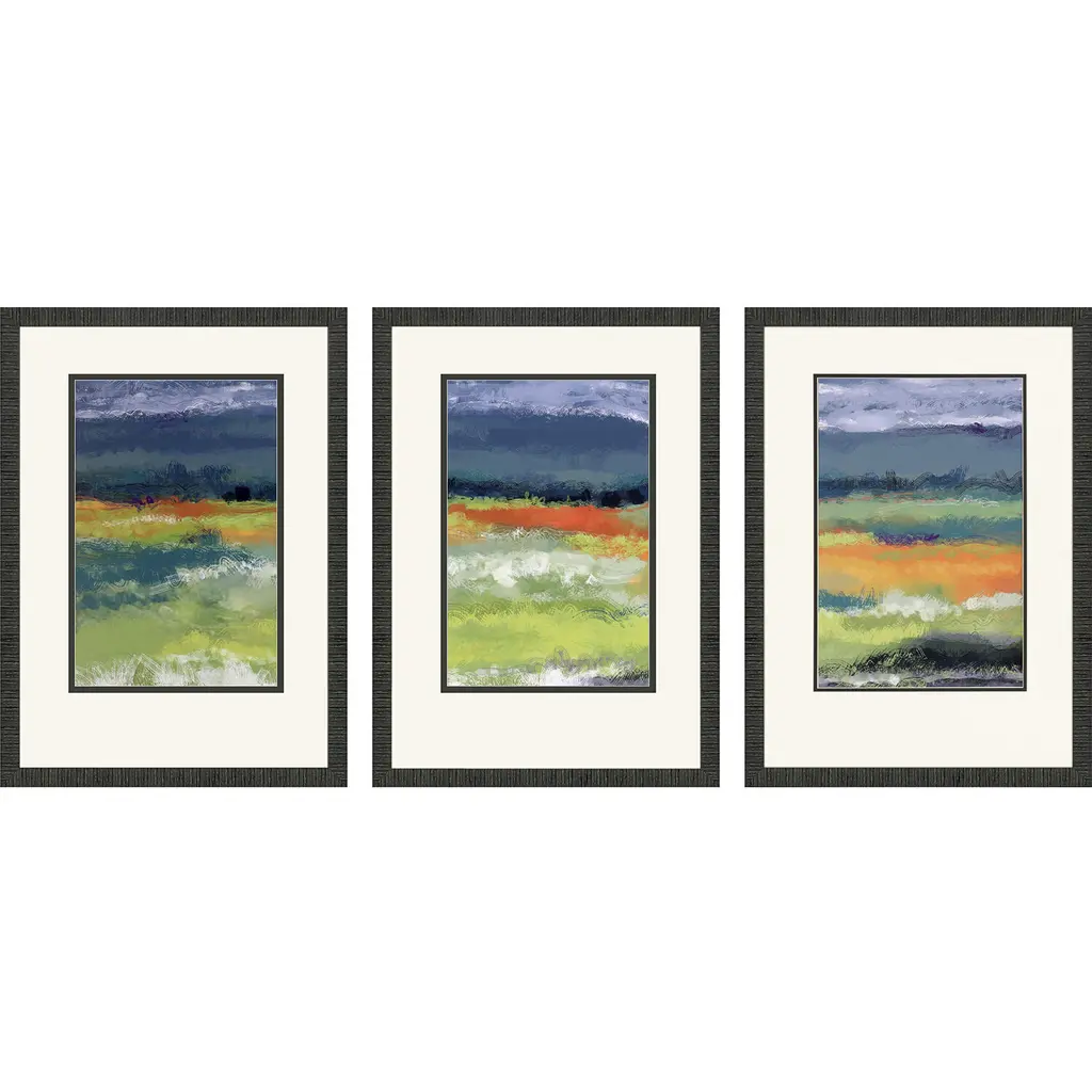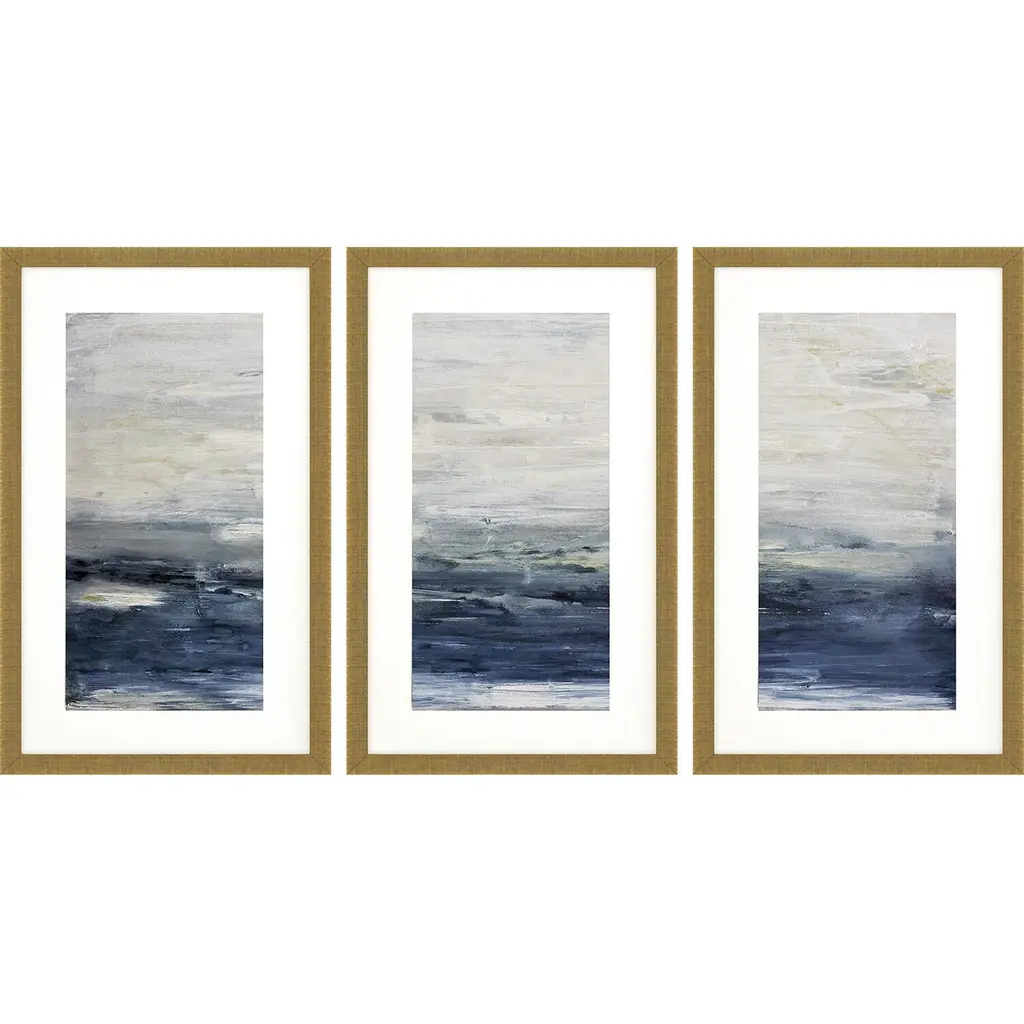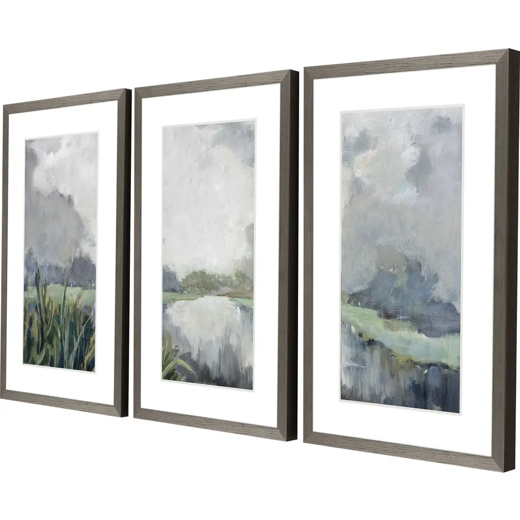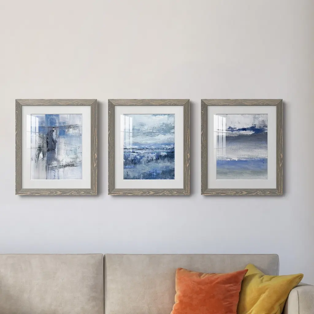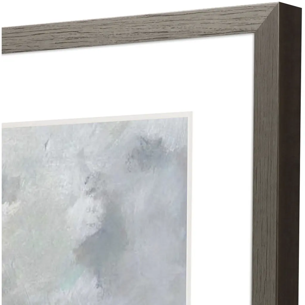 A landscape of soft blues and grays is matted in white. Framed in a brushed silver finish shadow box style moulding.