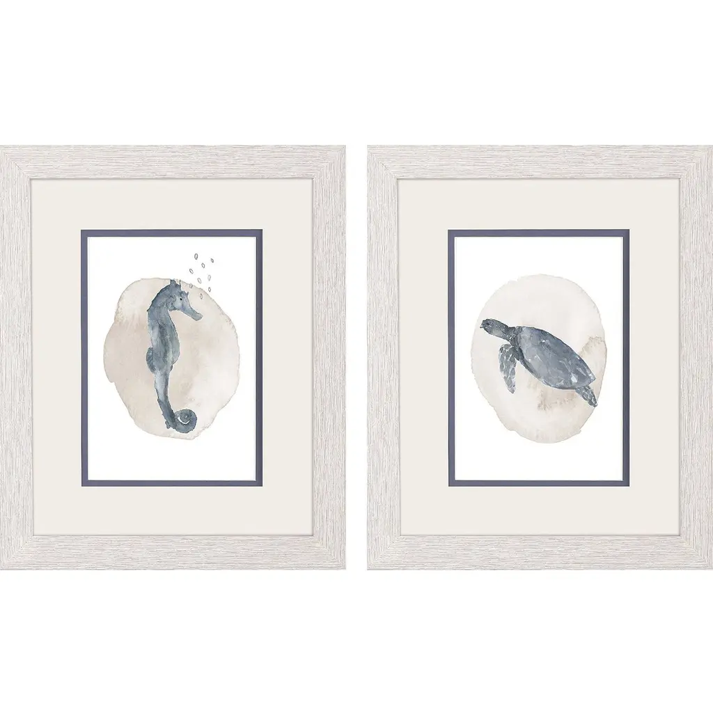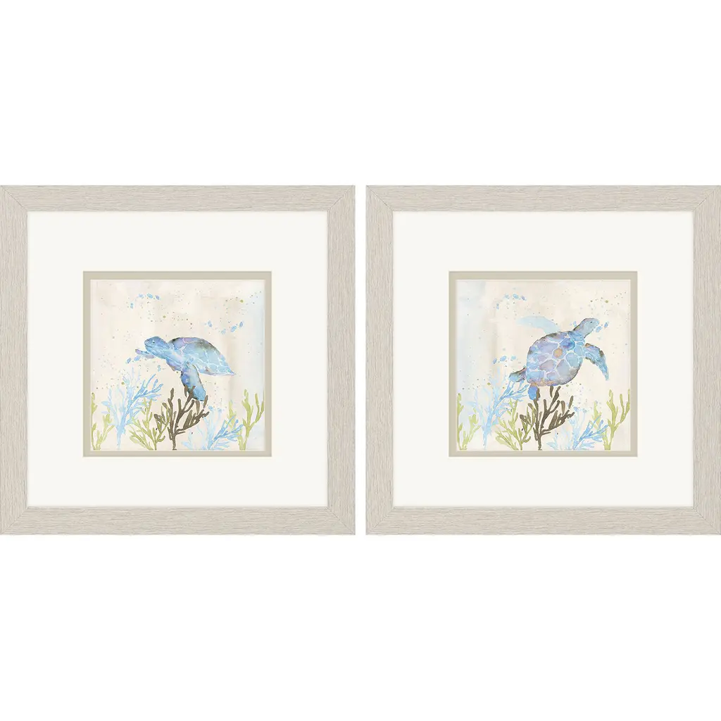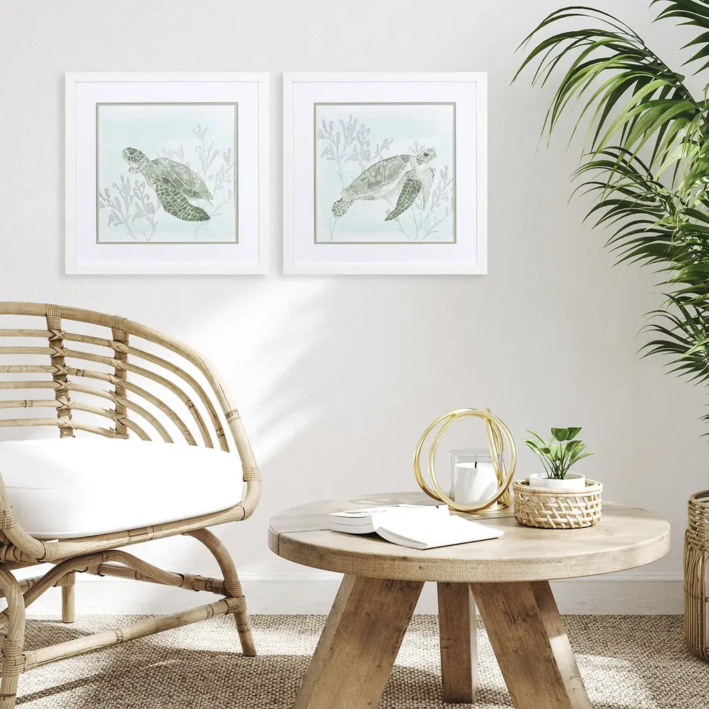 A set of two coastal coral images that are accentuated with double matting, framed under glass and paired with a matte white frame.