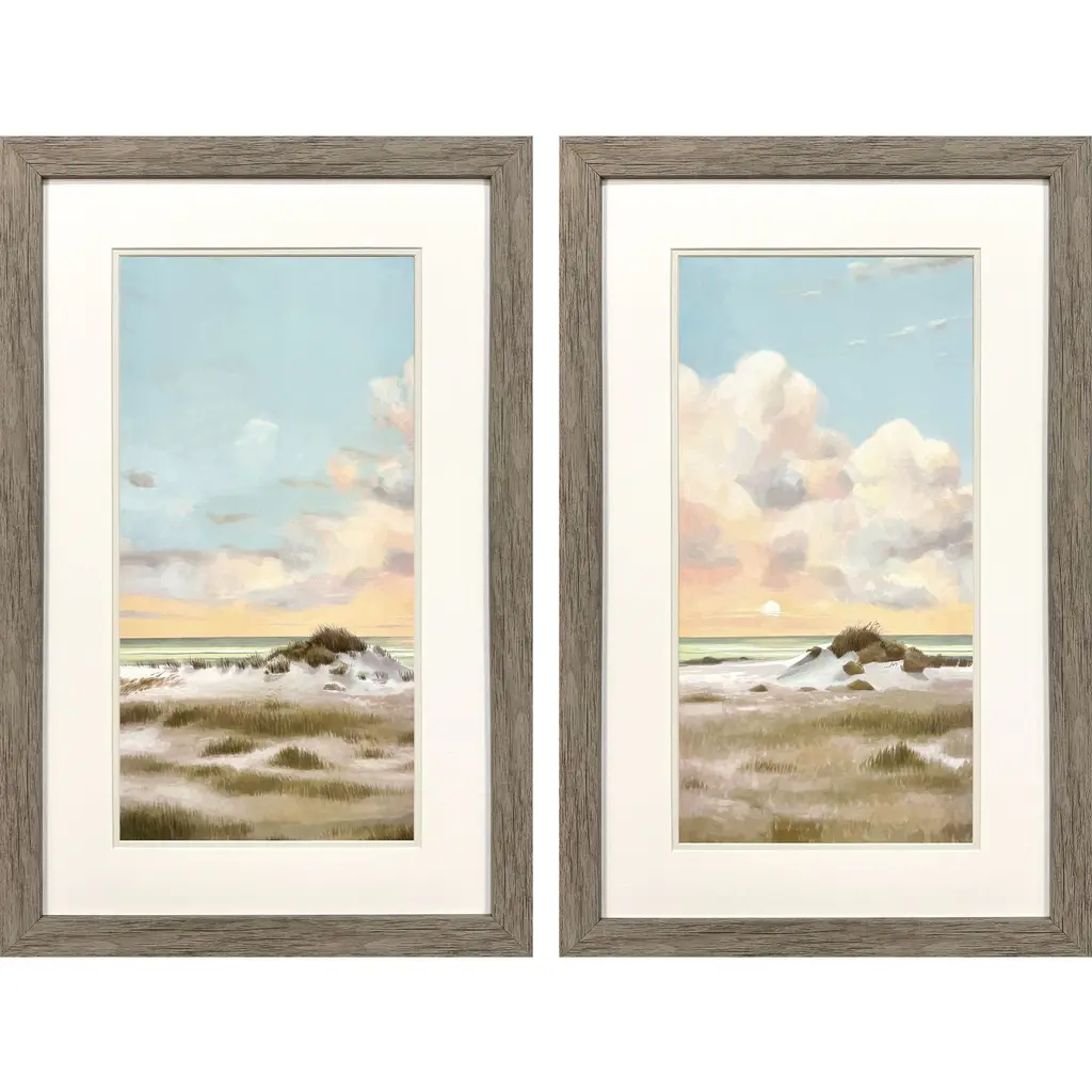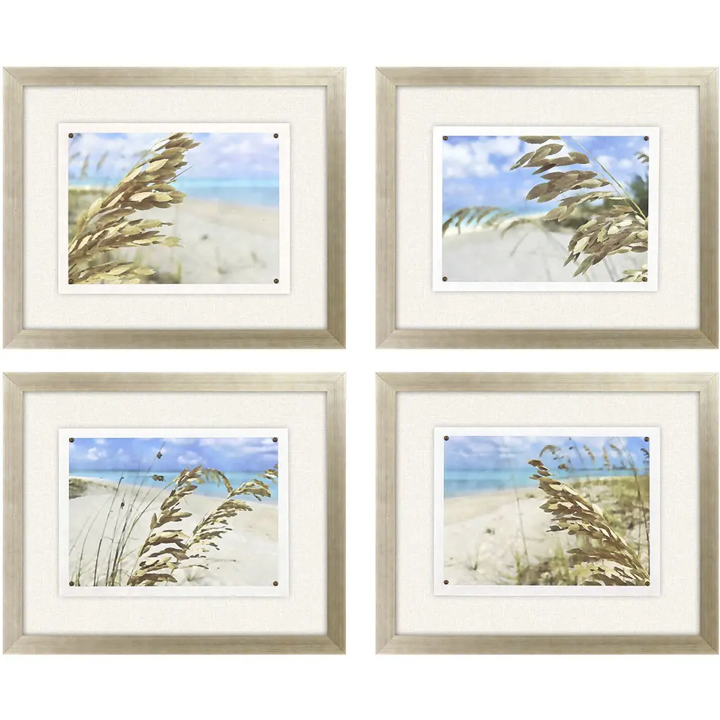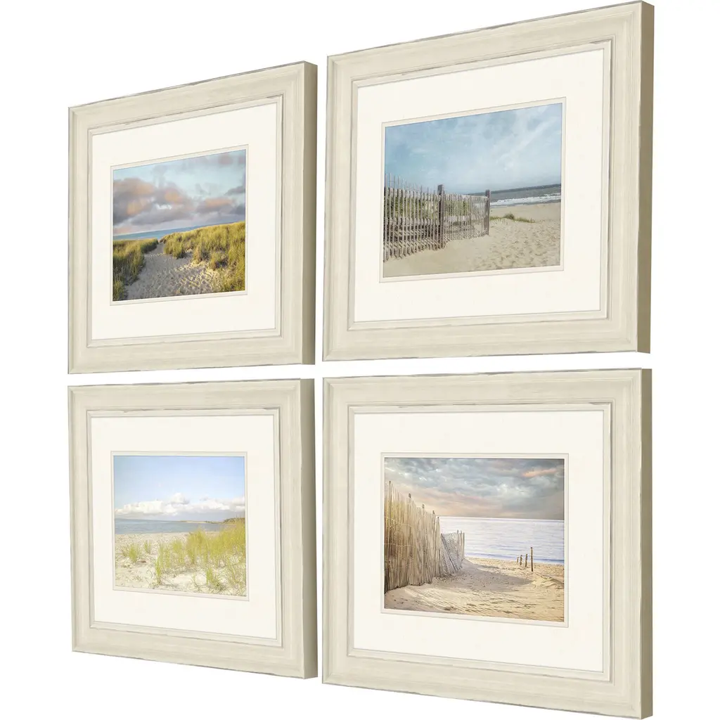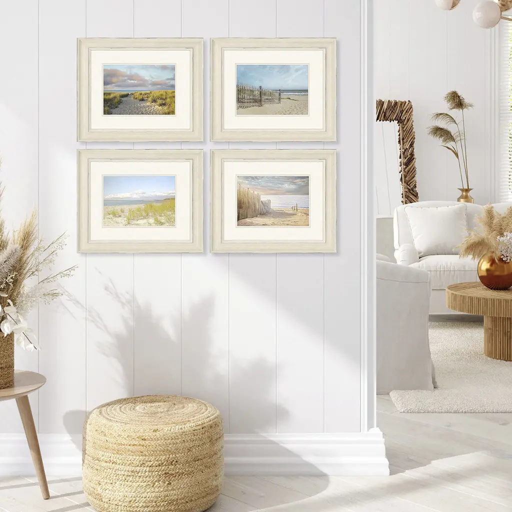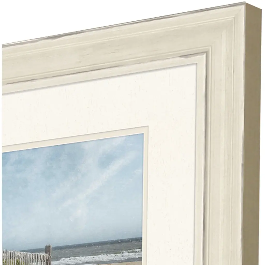 Natural beach scenes feature premium matting. Framed in a distressed ivory wood.
