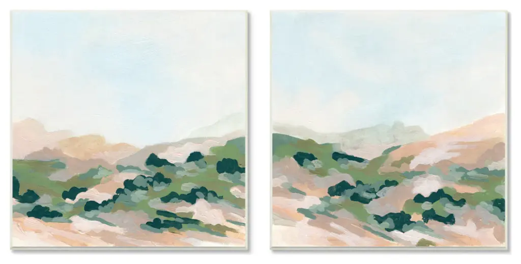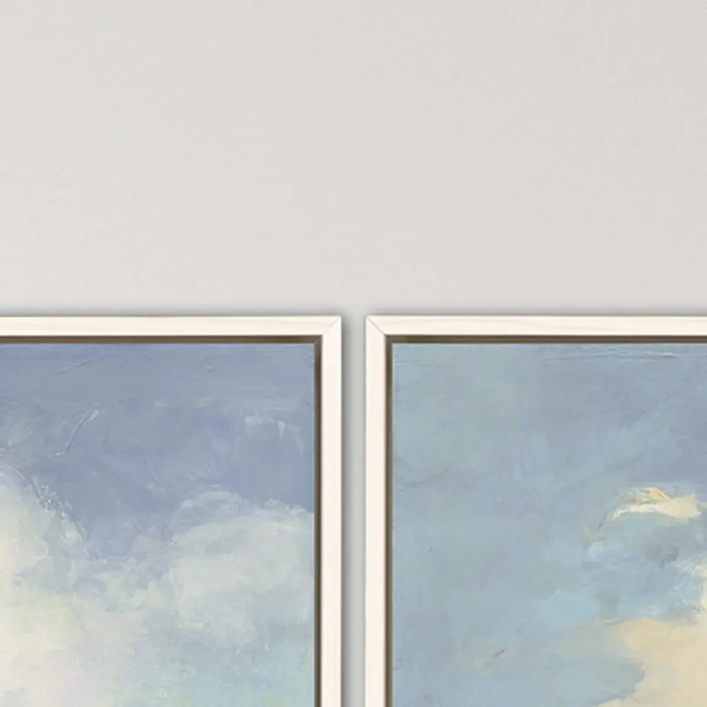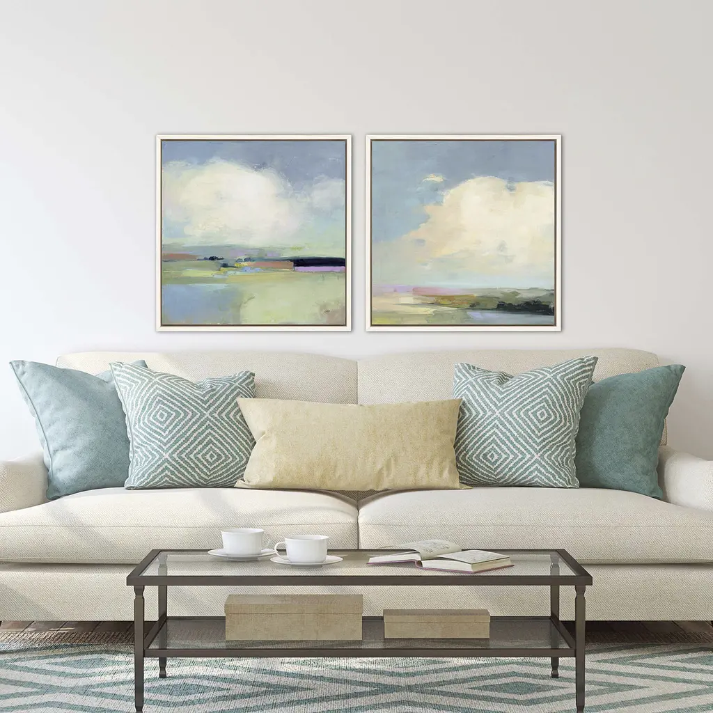 Coastal clouds float above a vivid landscape with a hand applied enhanced gel finish. Mounted in a whitewash wood floater frame.