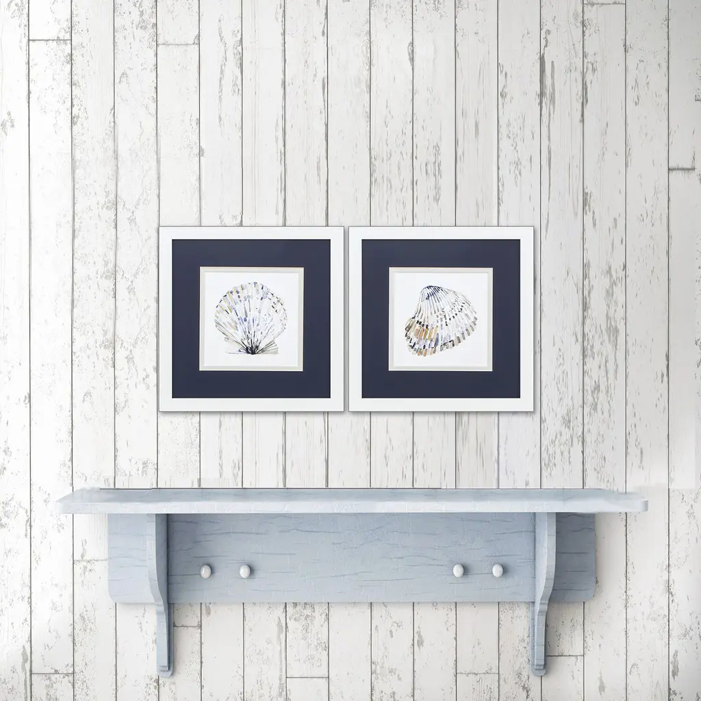 A set of two seashell images that have been matted and framed under glass in a complimenting moulding.