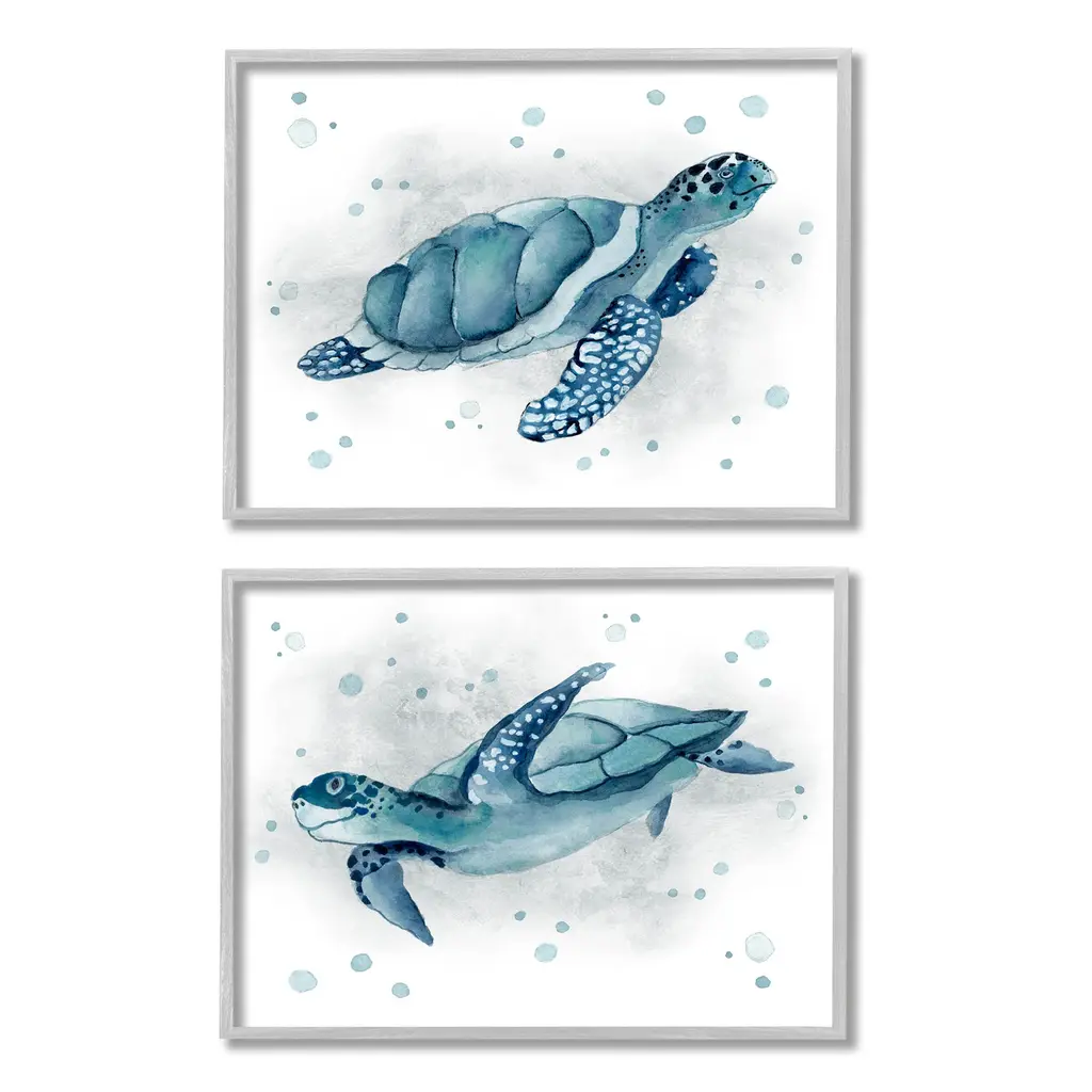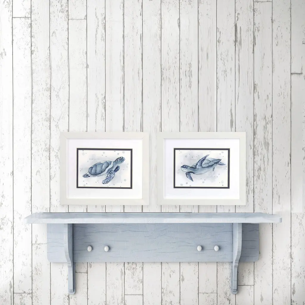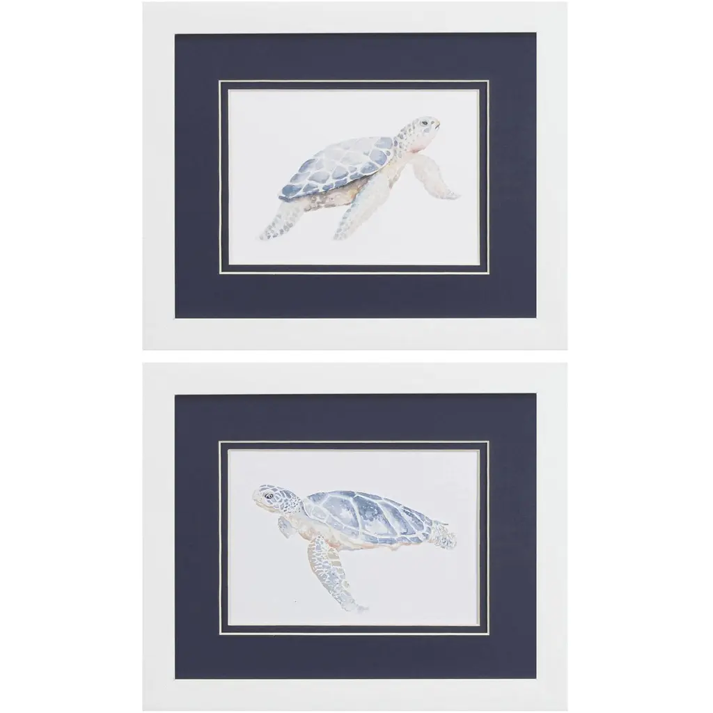 A set of two coastal turtle images in blue are double matted in white and navy blue. Framed in a modern flat white moulding.