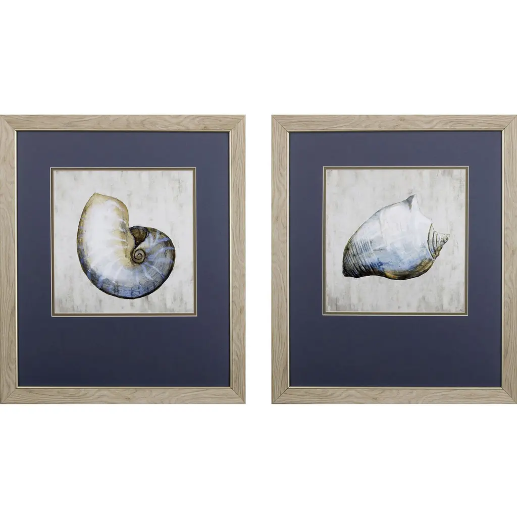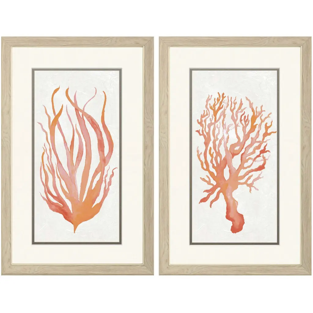 A set of two neutral coral prints that are double matted and framed under glass with a white wash frame.