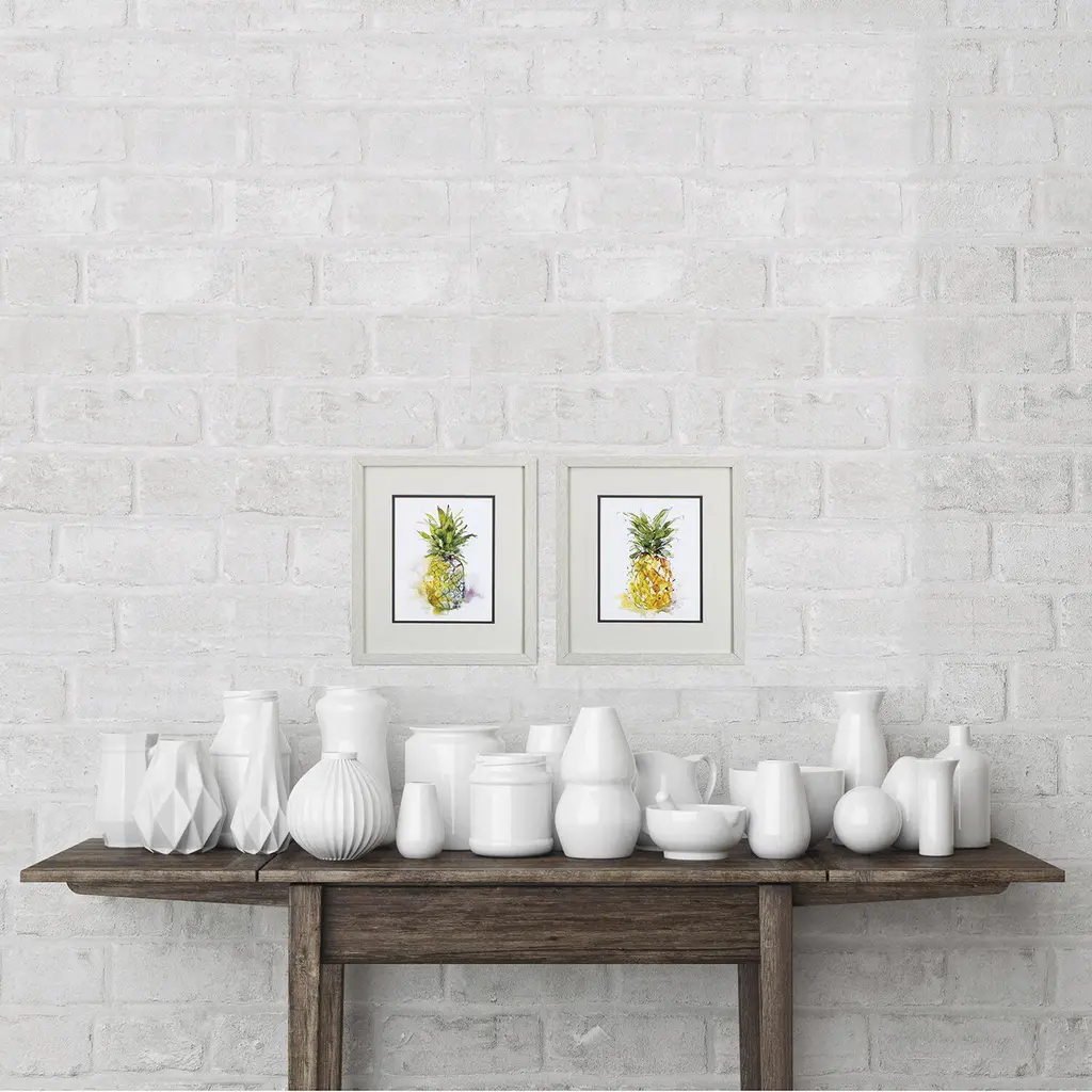 A set of two yellow pineapple prints have a contemporary vibe. Double matted and framed in a distressed whitewash finish moulding.