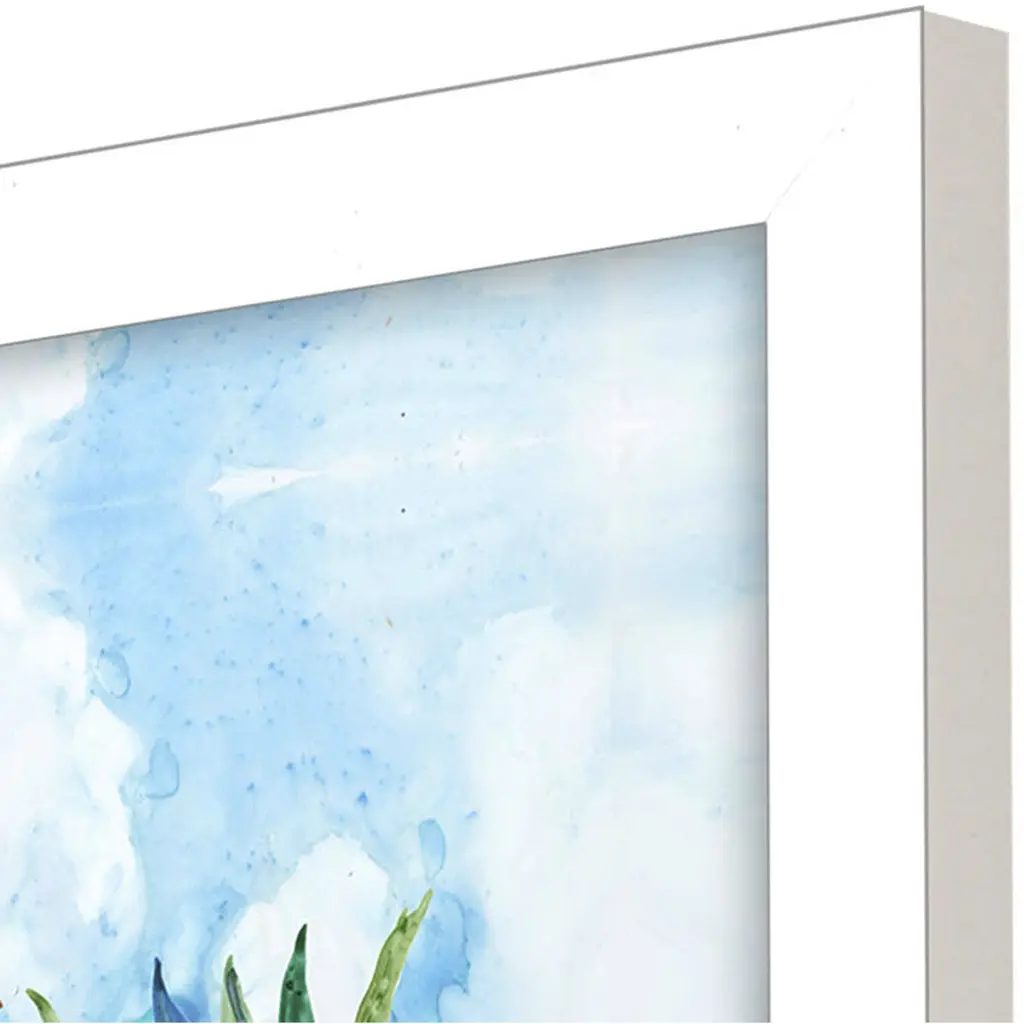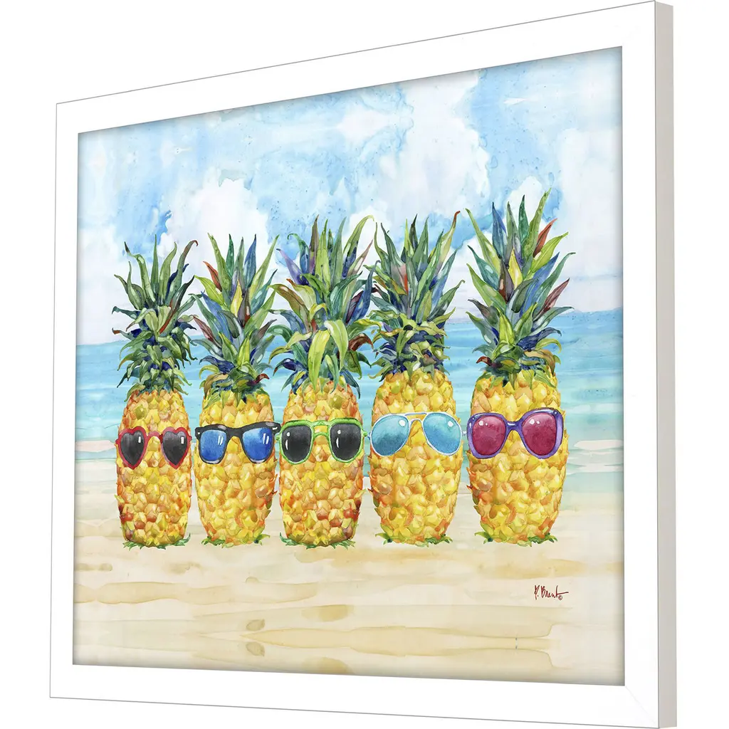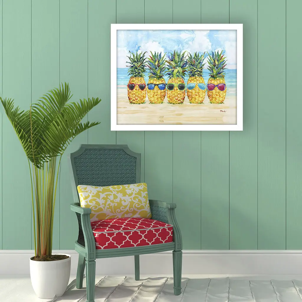 Wacky pineapples are ready to party at the beach. Framed in a block profile moulding in a matte white finish.