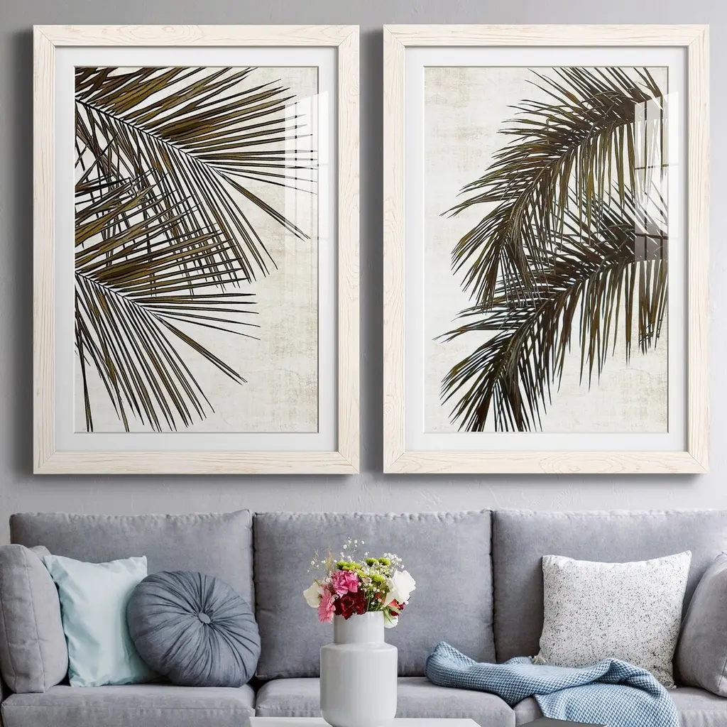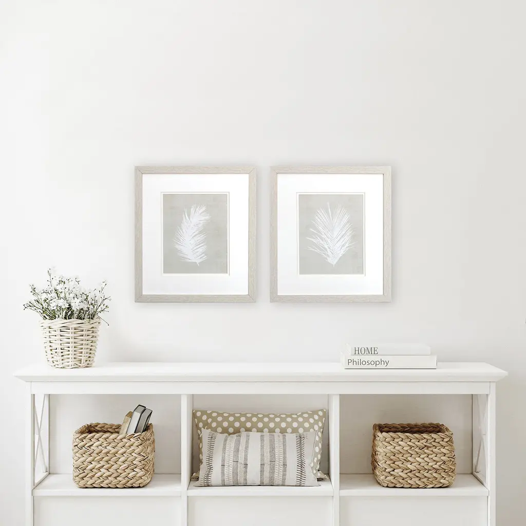 A set of two neutral palm prints in a classic styling are double matted in white. Framed in a distressed whitewash finish moulding.