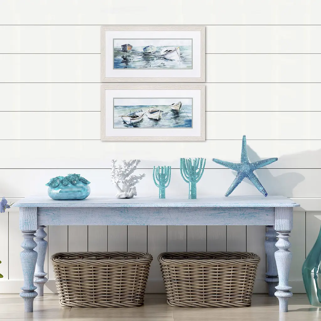Set of two horizontal coastal images that have been double matted and finished under glass with a complimenting white wash frame.