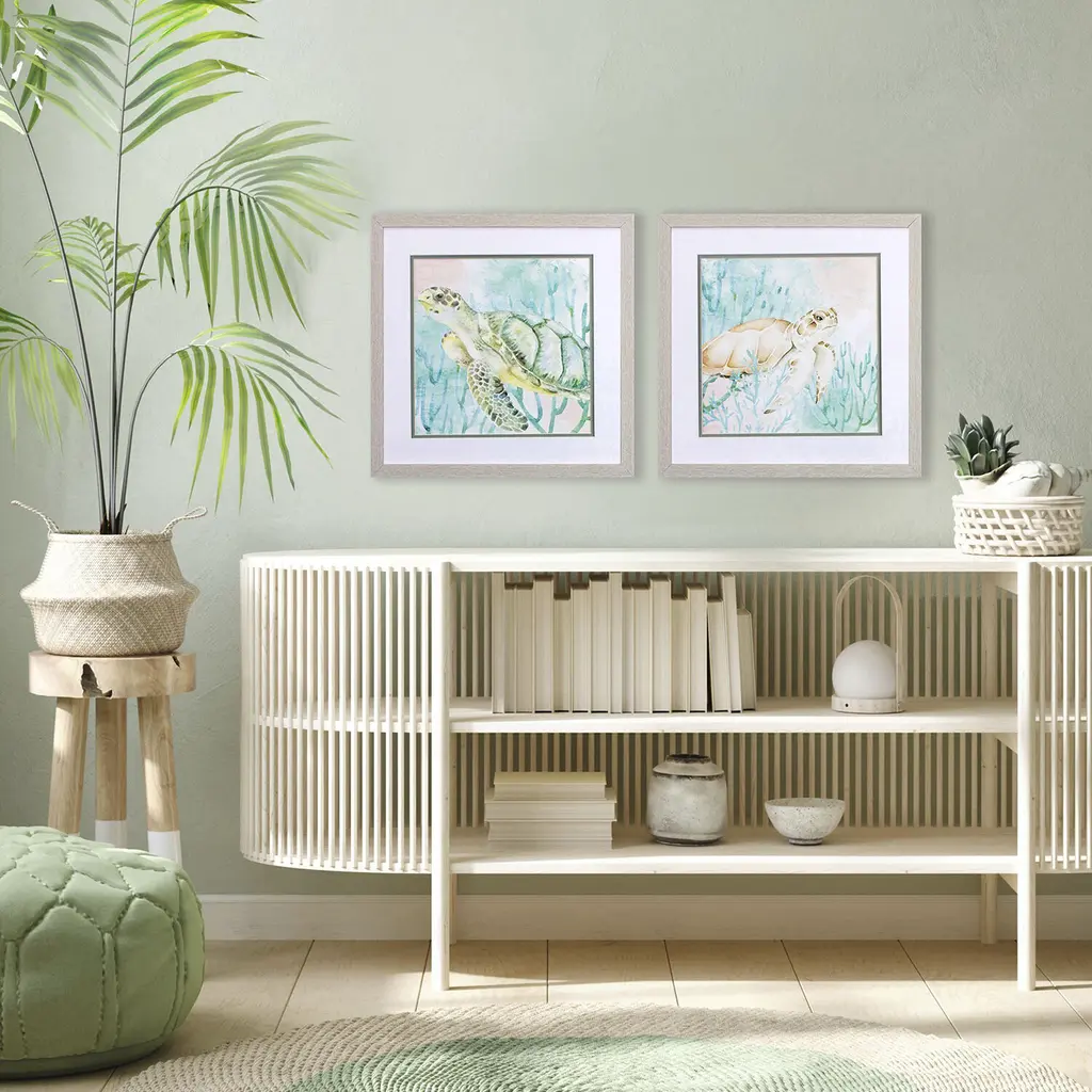 A set of two tropical sea turtle prints that are double matted, framed under glass and paired with a white wash wood texture frame.