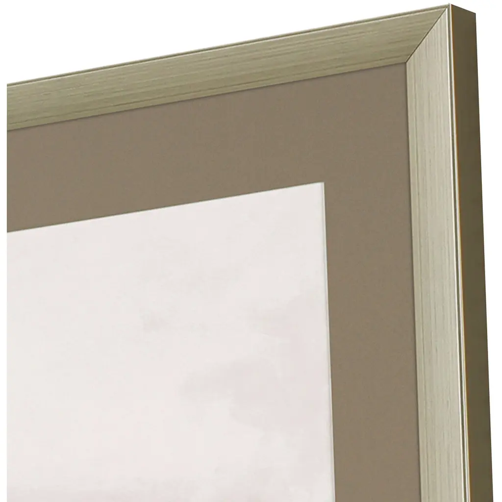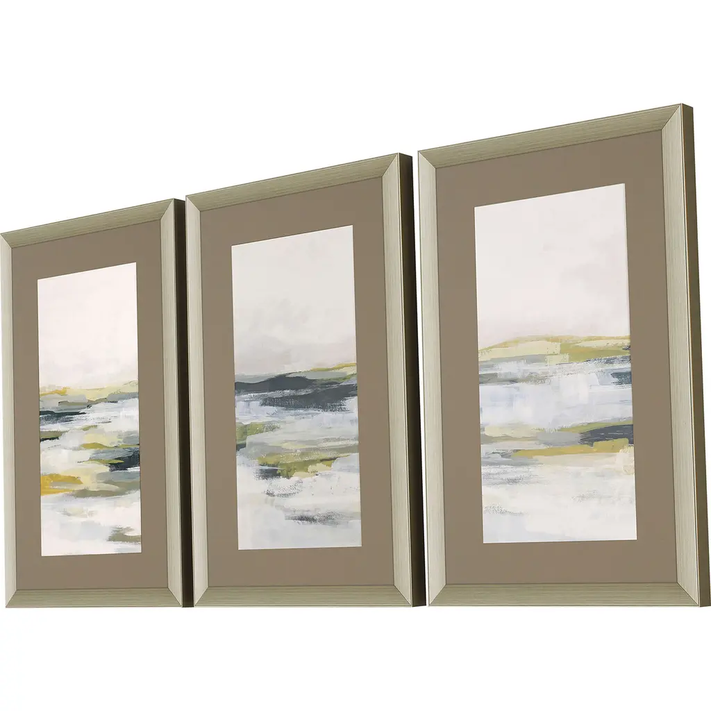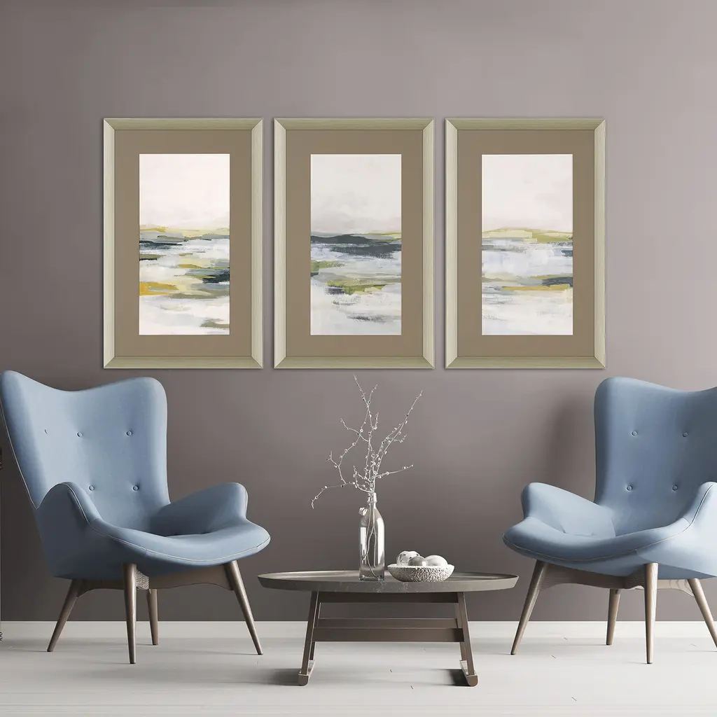 A gentle contemporary landscape series in shades of blue and green, is matted in moss and framed in a modern warm silver moulding.