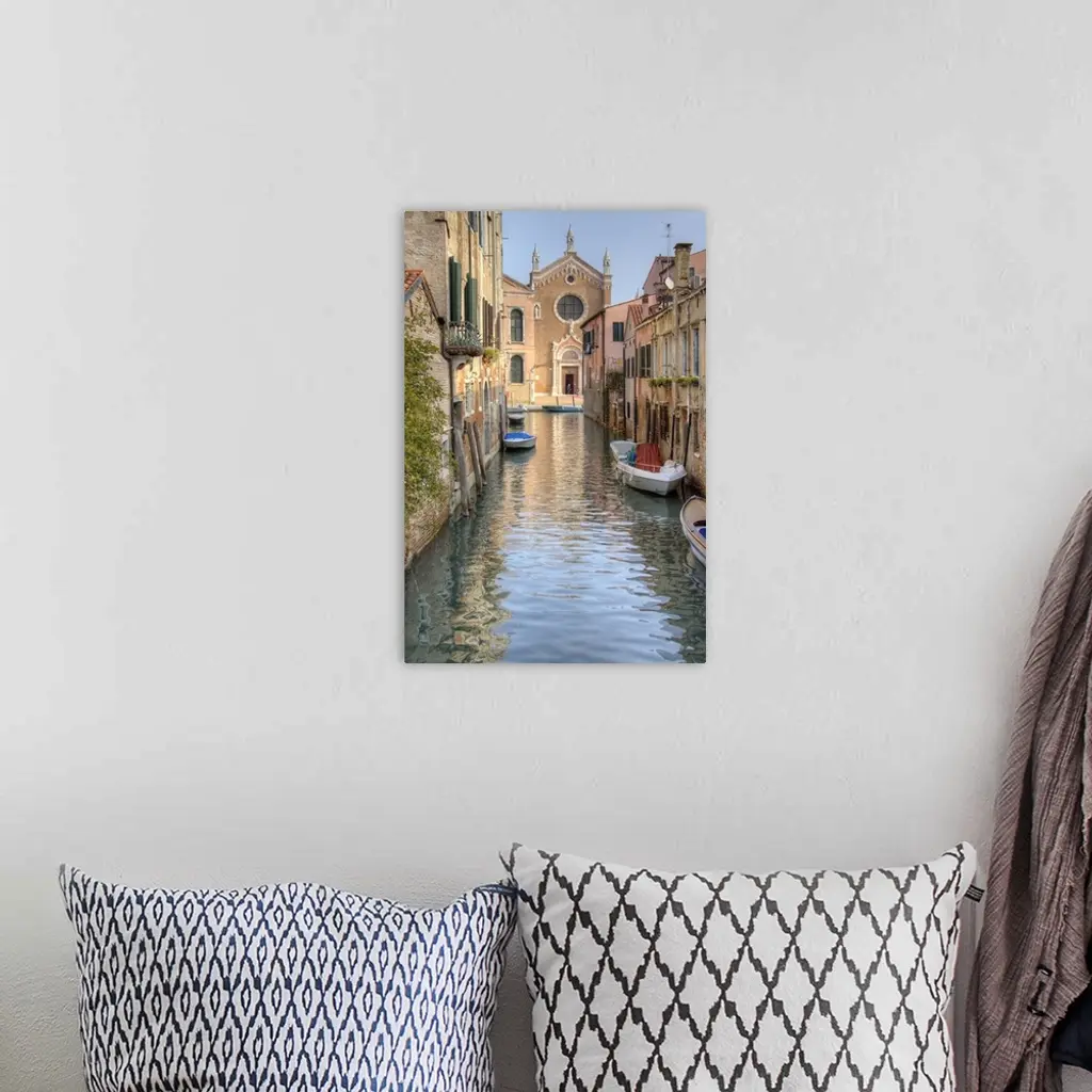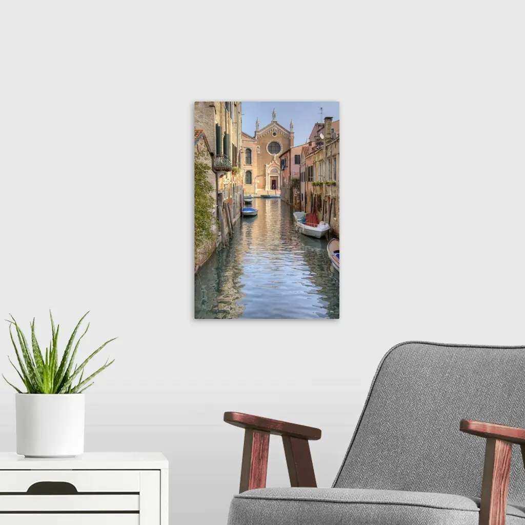 HDR photograph of a canal flowing through the alleys of Venice, Italy, with small boats floating moored to the edge.