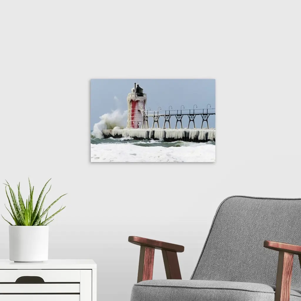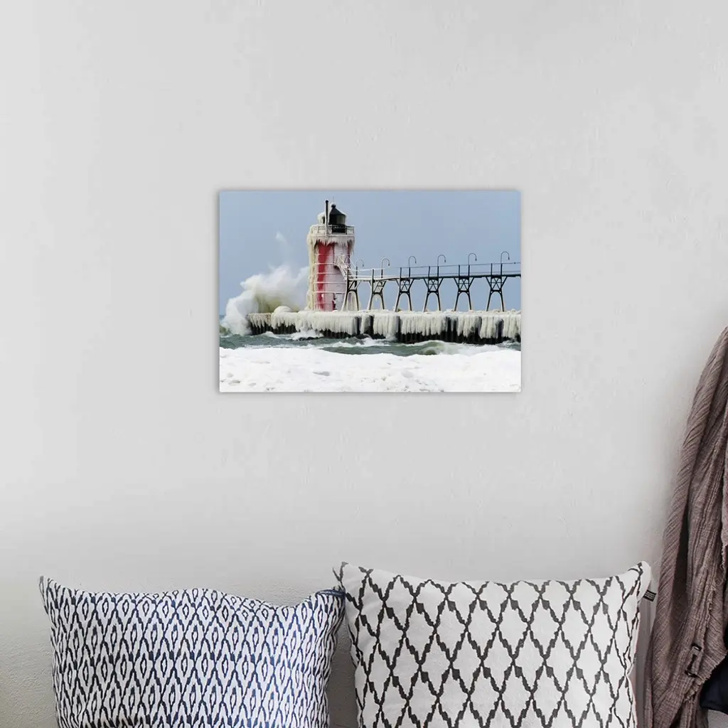 Wave crashing on snow-covered South Pier lighthouse, South Haven, Michigan wall art for home and office decor. Discover canvas art prints, photos, mural, big canvas art and framed wall art in GreatBigCanvas.com's varied collections.