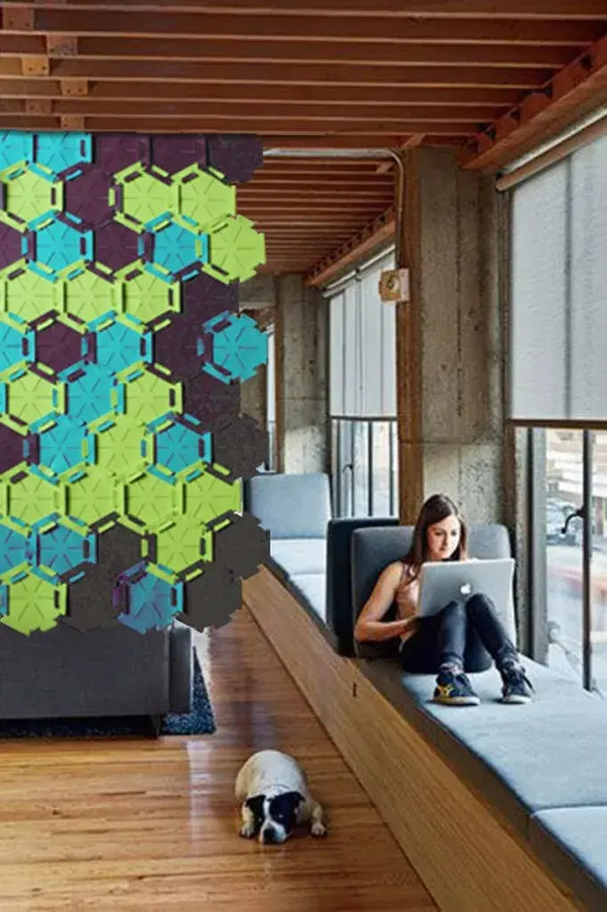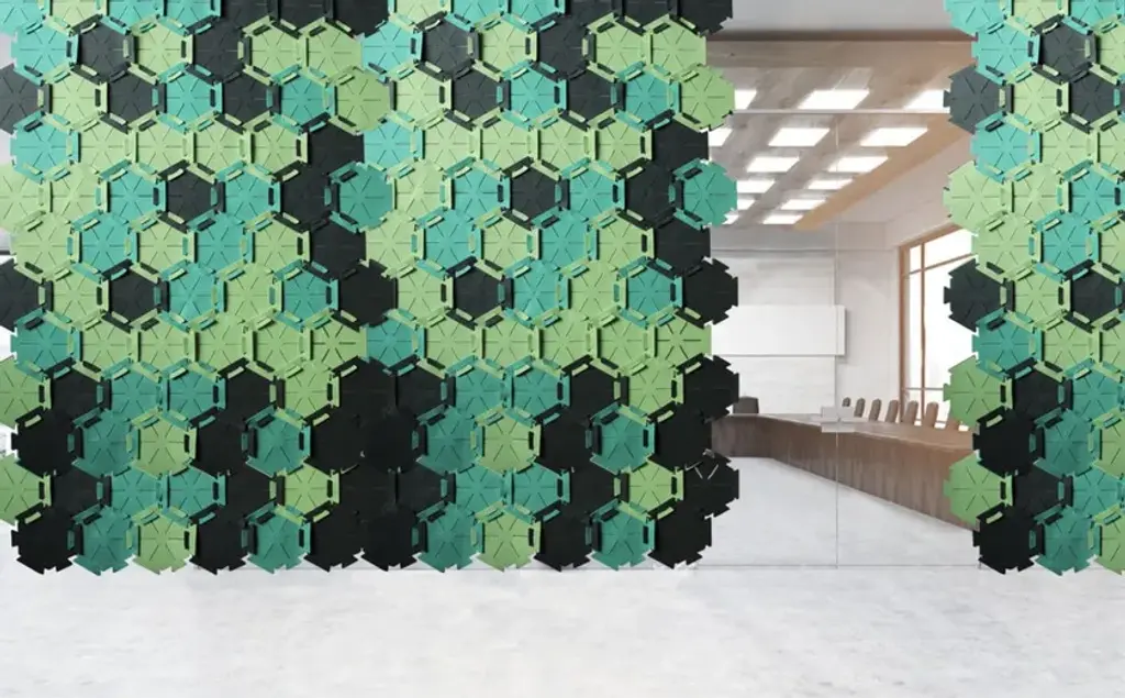 SLALOM ACOUSTIC’ WAVE is a product that combines acoustic performance with the sensitivity of contemporary furnishings.Modular system consisting of hexagonal shapes made from PETfelt – recycled plastic felt – WAVE allows you to create new three-dimensional surfaces that are always different depending on your preference.FELT is a skin, an attractive finish to embrace your walls, your furniture or ceilings.Flexible, customizable and easy to apply.