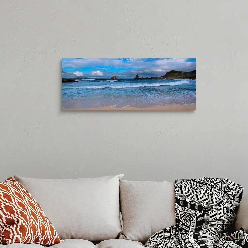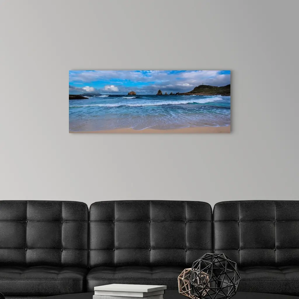 Waves and seasurf meeting the sandy beach at Grande-Terre with the Grand-Croix in the distance at the tip of Pointe des Chateaux, Guadeloupe, French West Indies