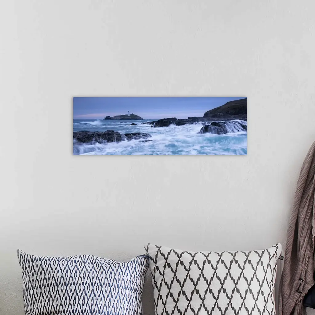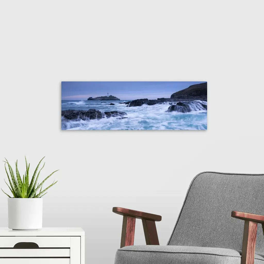 Waves Crash Around The Rocks Near Godrevy Lighthouse, Cornwall, England