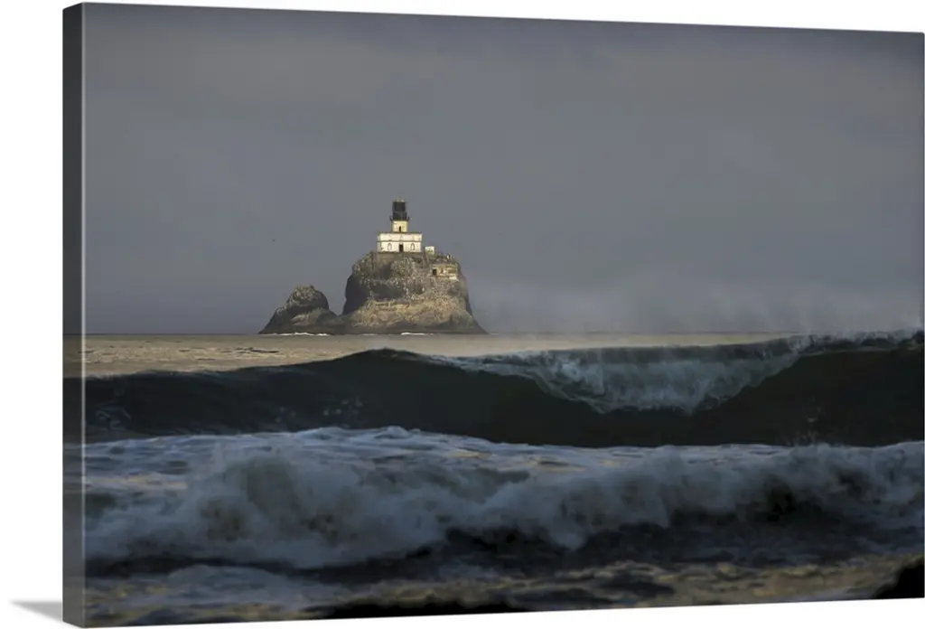 Waves crash around the rocks near Godrevy Lighthouse, Cornwall, England. Winter (February)