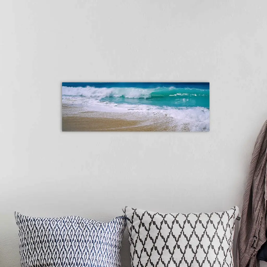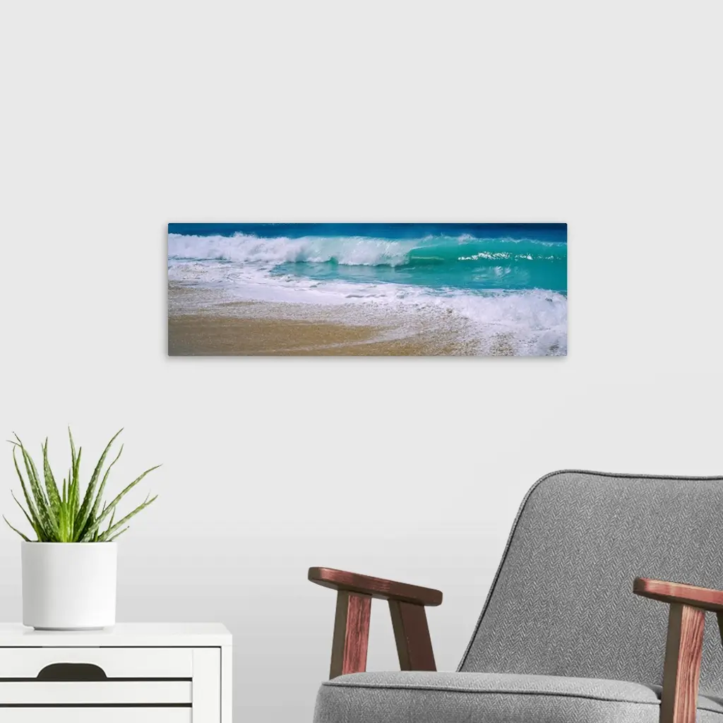 Panoramic photograph of water crashing onto the sand and being swept back out to sea.