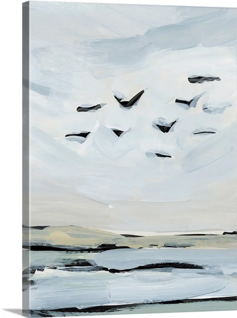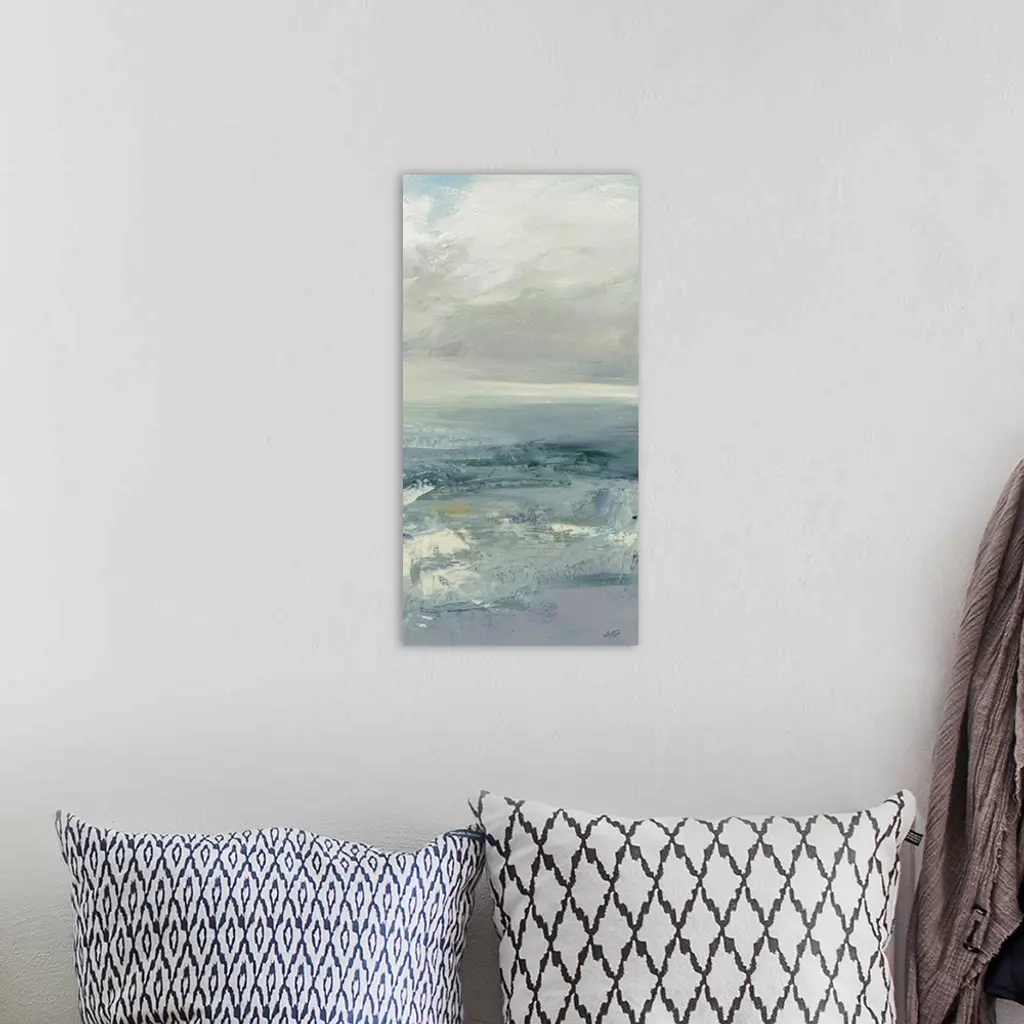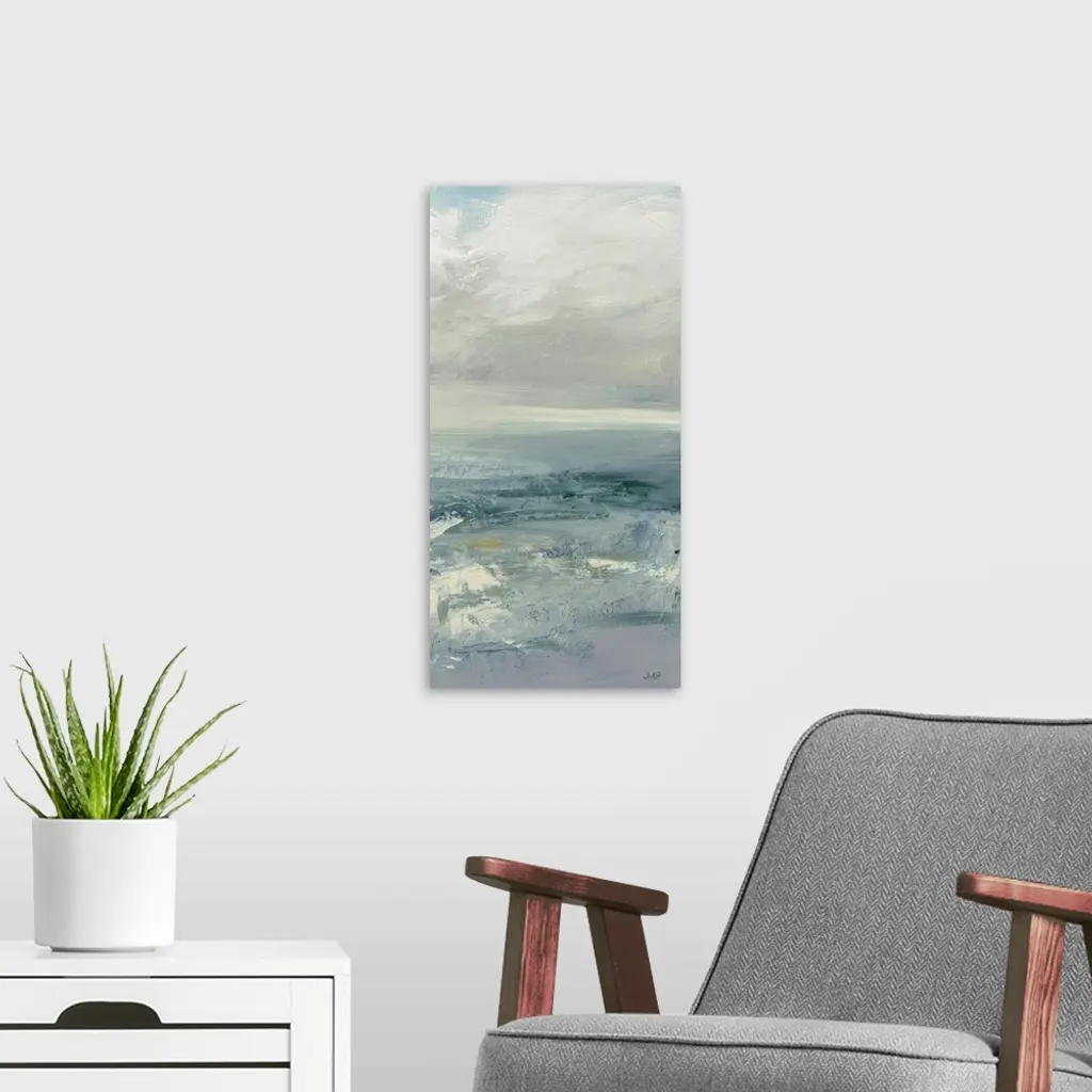 A large vertical abstract of ocean waves in textured cool tones of blue and gray.
