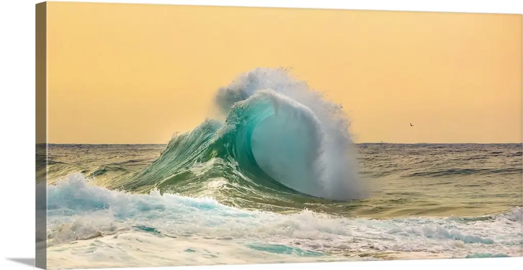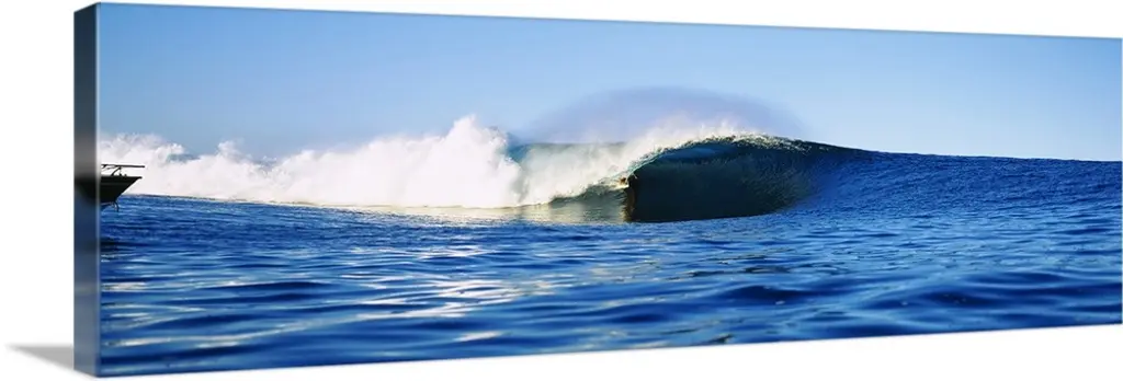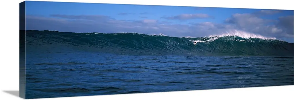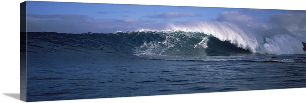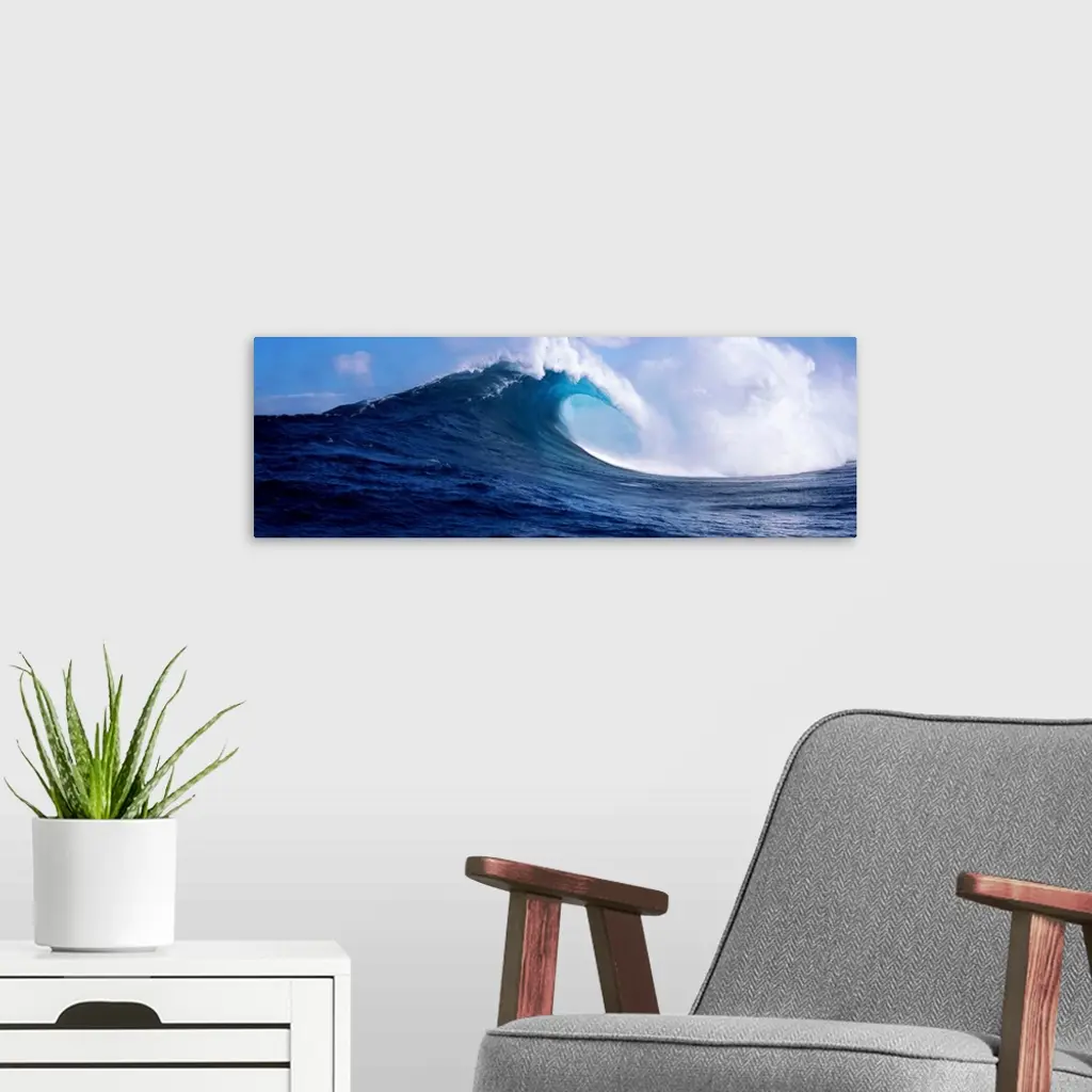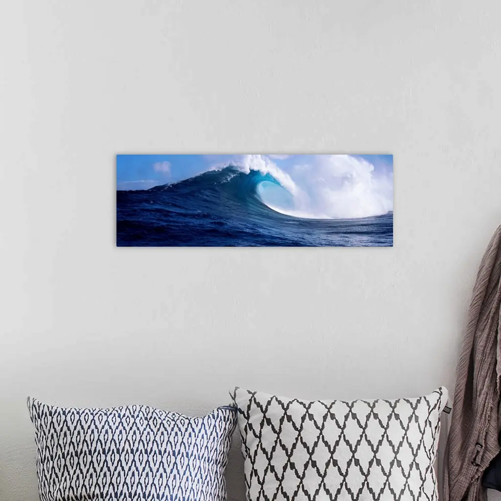A panoramic photograph capturing a plunging wave in motion as it prepares to break on the surface of the sea.